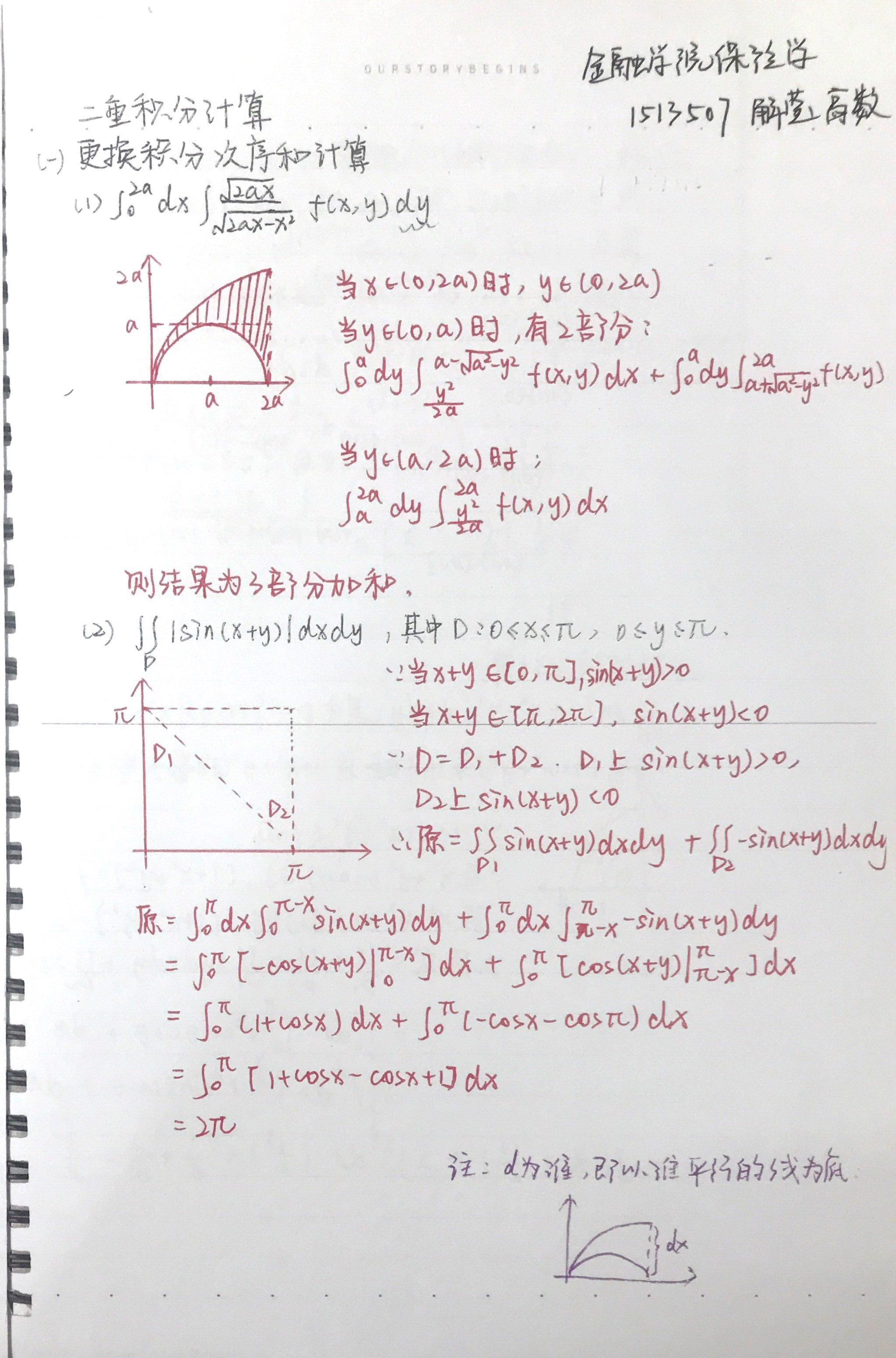 成果类型:笔记类 成果简介:本物品为《高等数学》课程积分部分例题笔记 所属人简介:解莹曾获2018-2019学年度南开大学综合一等奖学金;中国大学生保险责任行南开保险“公能”社会实践队队员(2016),深圳“艾森国瑞金融-金鹰训练营”第二期优秀营员(2017),南开大学金融学院“学习延安精神与探索延安红色文化”主题社会实践队队员(2017),“中国扶贫基金会-花旗大学生金融素质项目”优秀结业学员(2015)