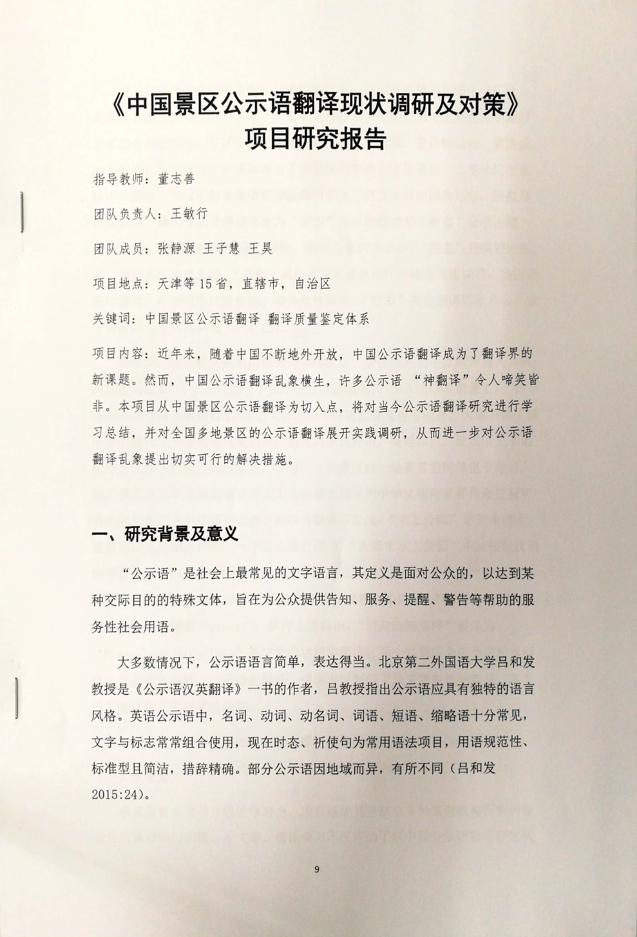 成果类型:笔记类 成果简介:此为景区公示语翻译现状调研,这份调查报告契合当今中国日益深化“走出去”战略的大背景,详细考察了中国多家5a及4a级景区的公示语翻译情况,探究了一些翻译问题,并提出了操作性强的翻译质量评价标准,为中国外宣翻译提供了有益借鉴。 所属人简介:王昊曾获“市创”一等奖外研社杯写作大赛天津特等奖,全国二等奖