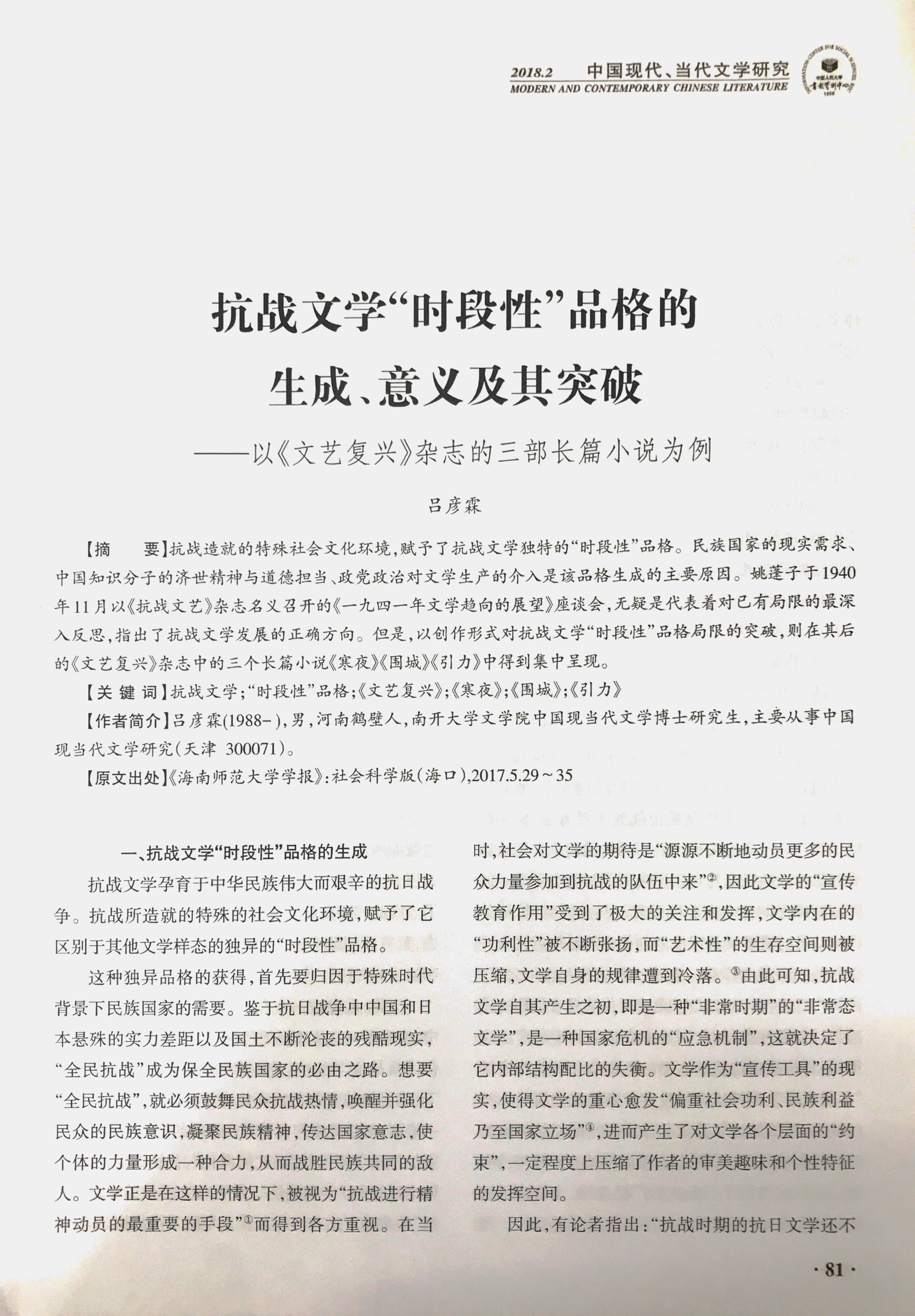 成果简介:此为吕彦霖发表的论文《抗战文学“时段性”品格的生成、意义及其突破》