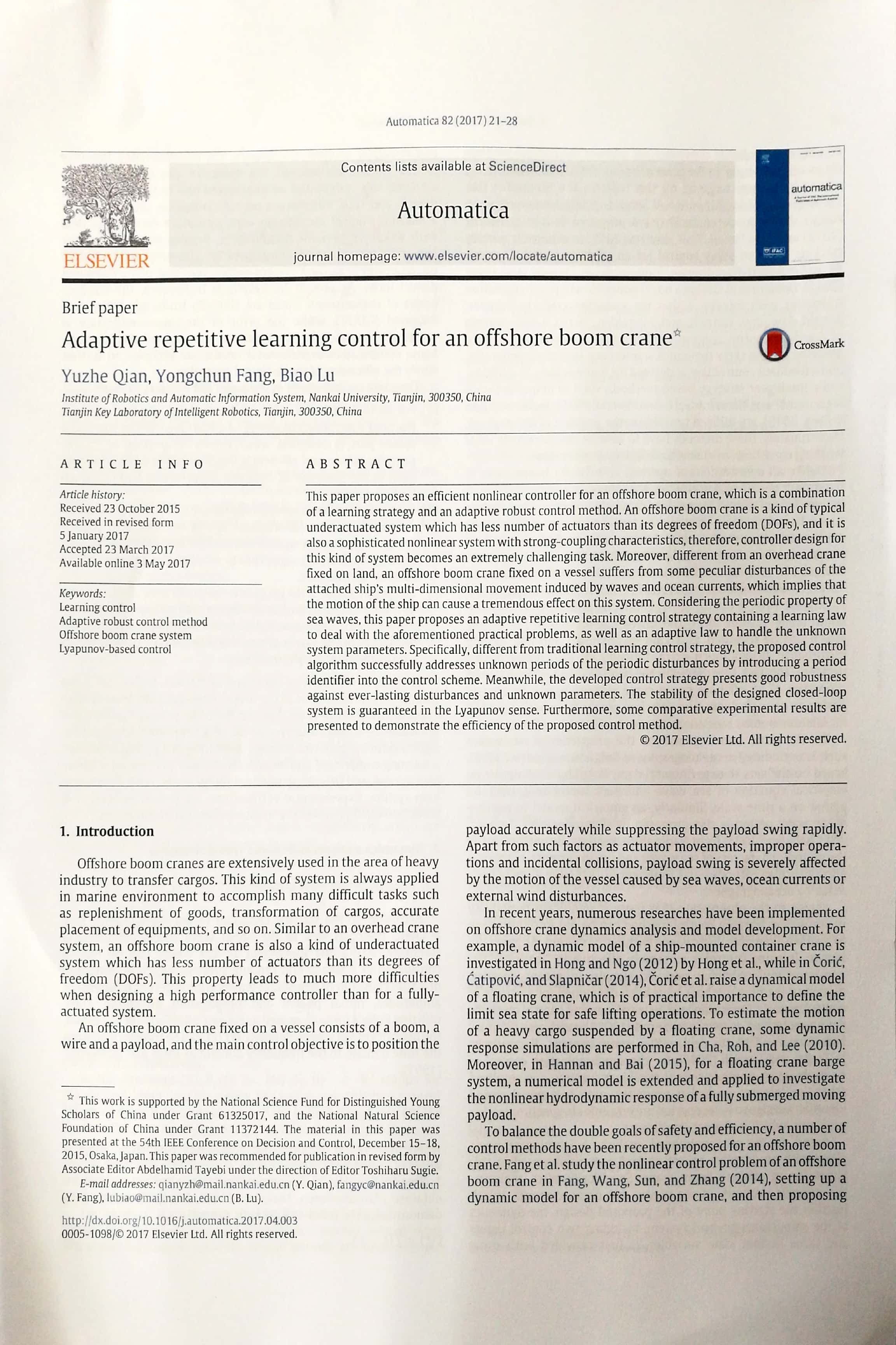 成果简介:她曾在控制领域顶级期刊Automatica发表学术论文,论文针对船用起重机的控制问题,提出了一种控制效果良好的学习控制方法。该期刊是控制领域公认的顶级期刊,SCI一区,2018年影响因子为6.126。