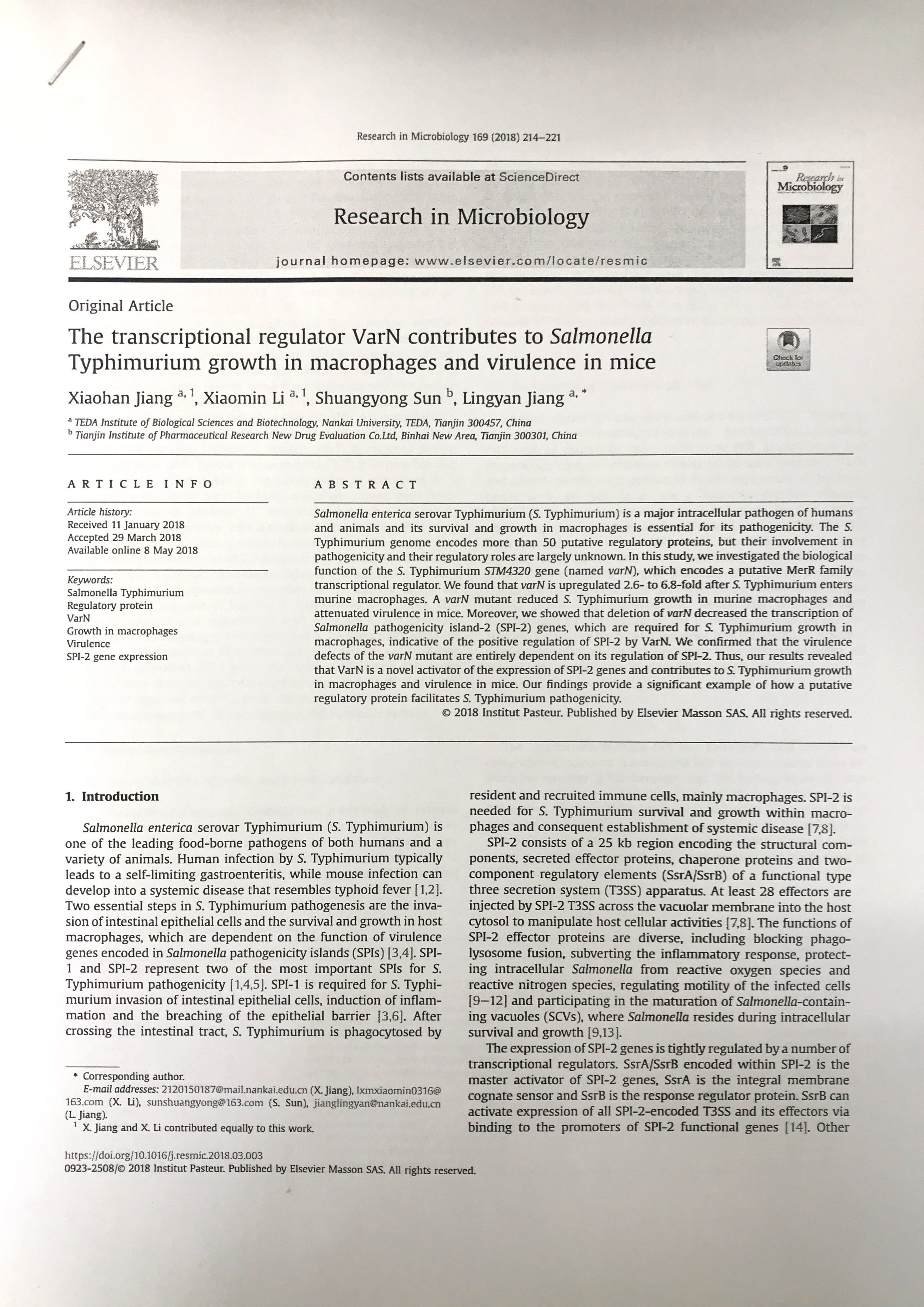 【19届泰达生物技术研究院毕业生李晓敏在学期间发表文章《The transcriptional regulator VarN contributes to Salmonella Typhimurium growth in macrophages and virulence in mice》】