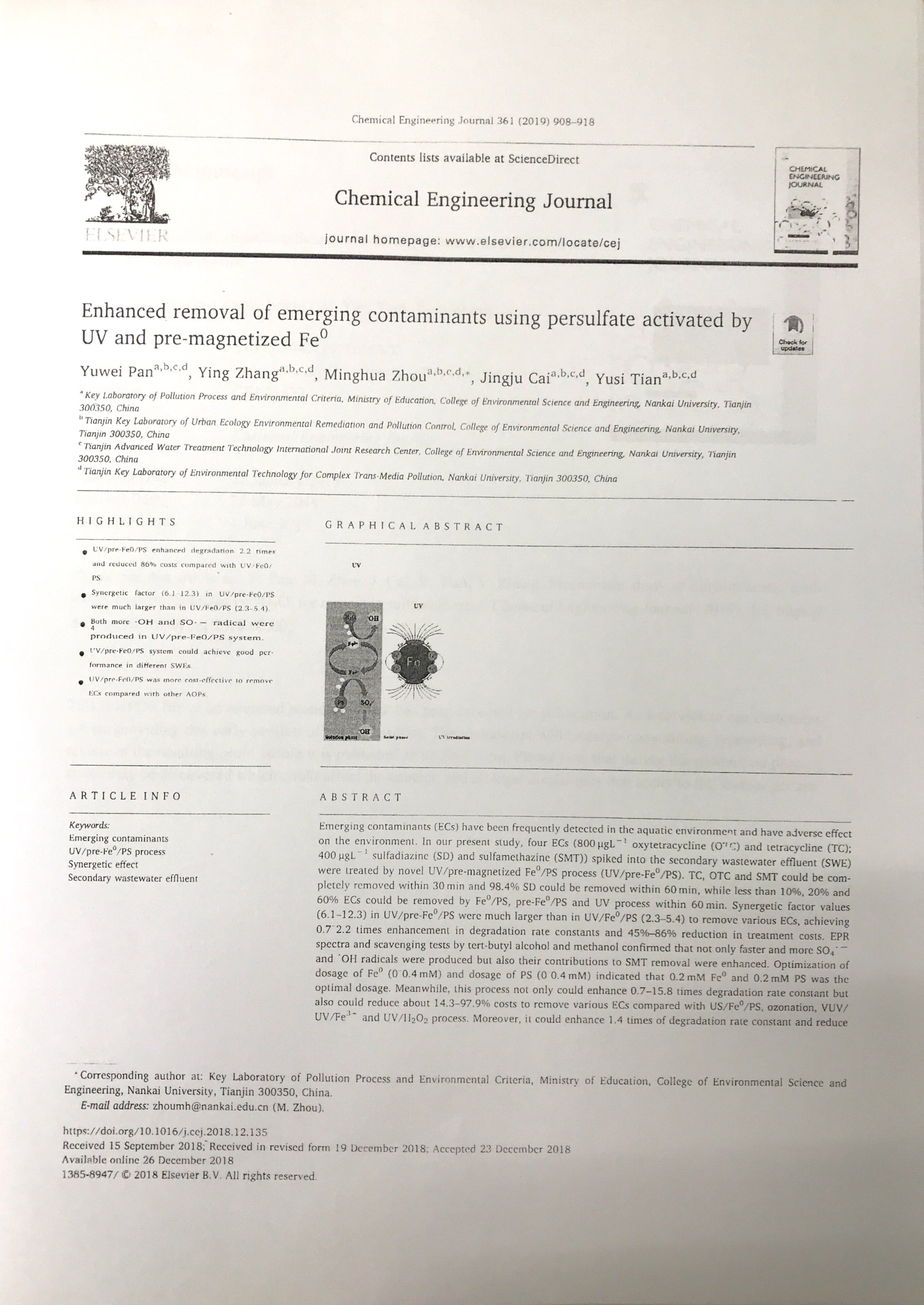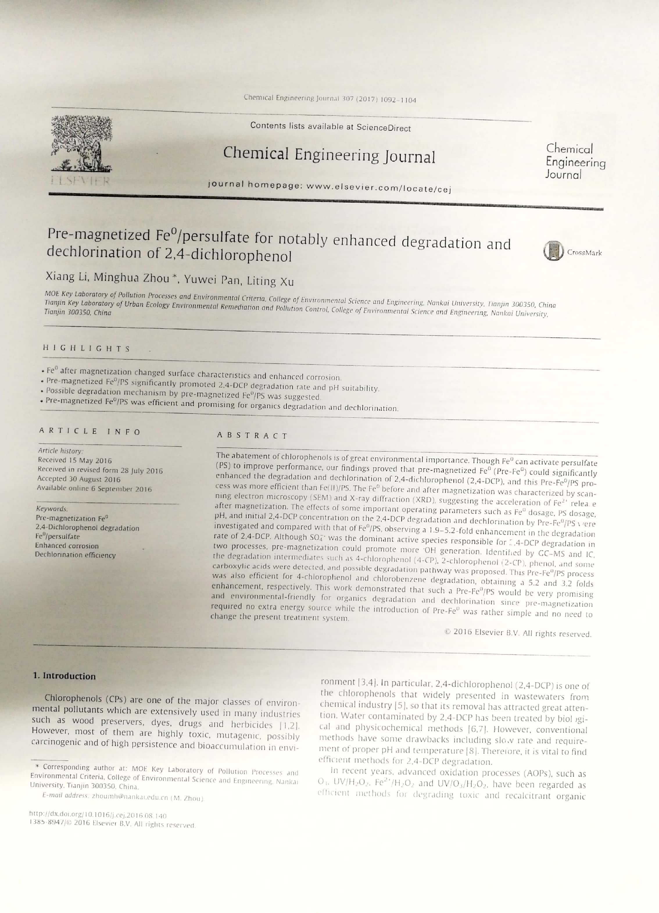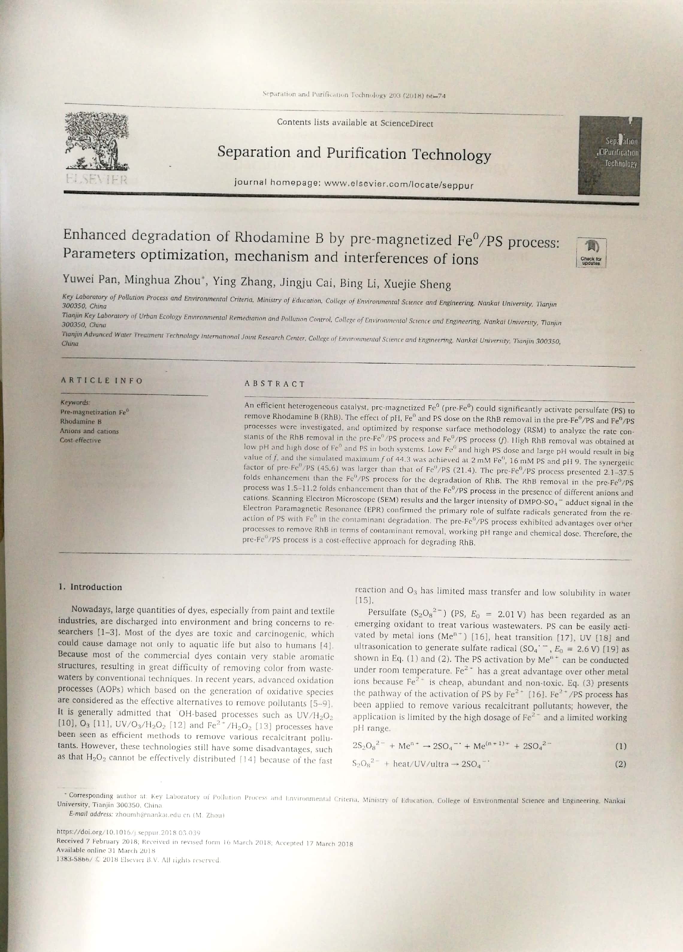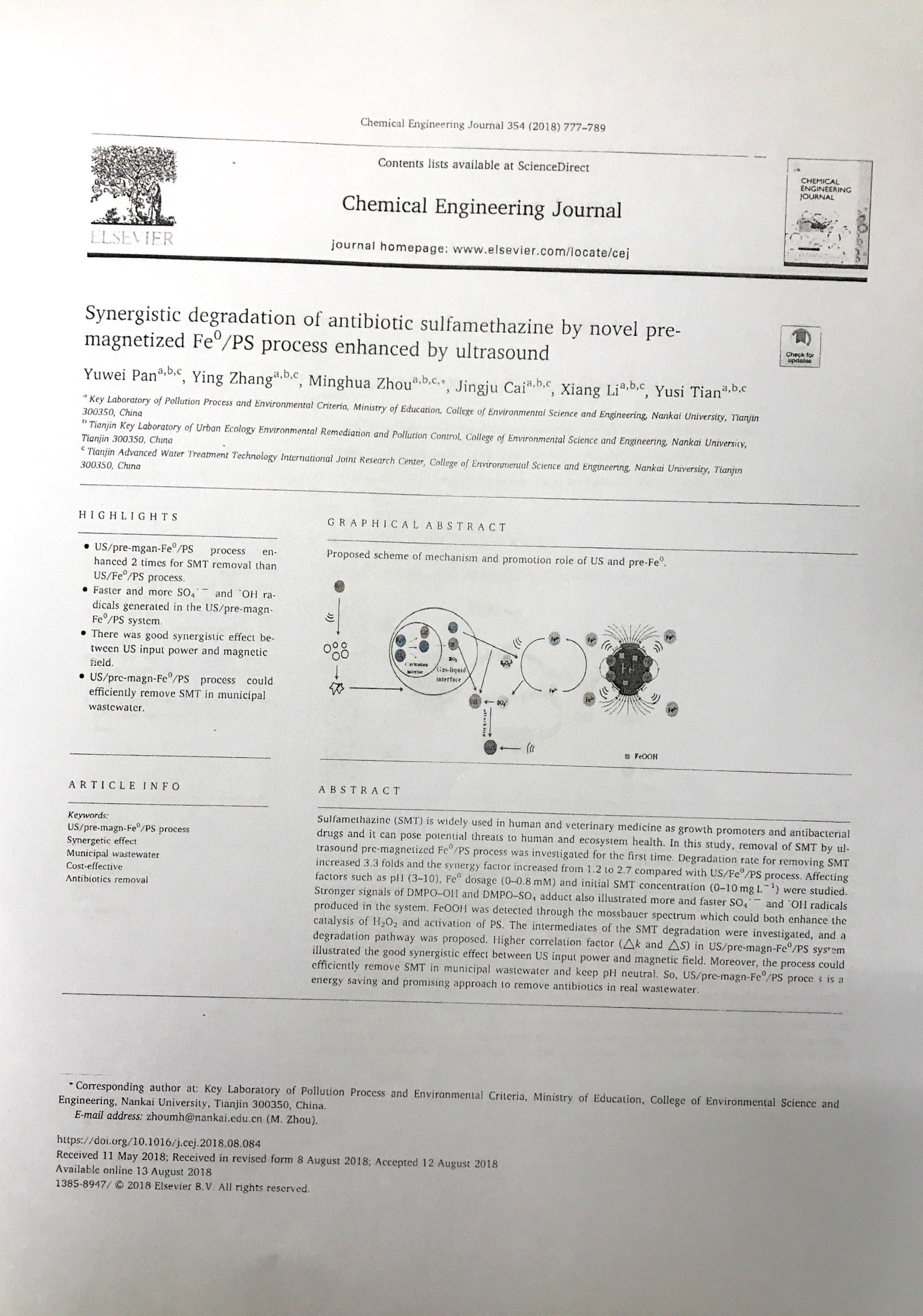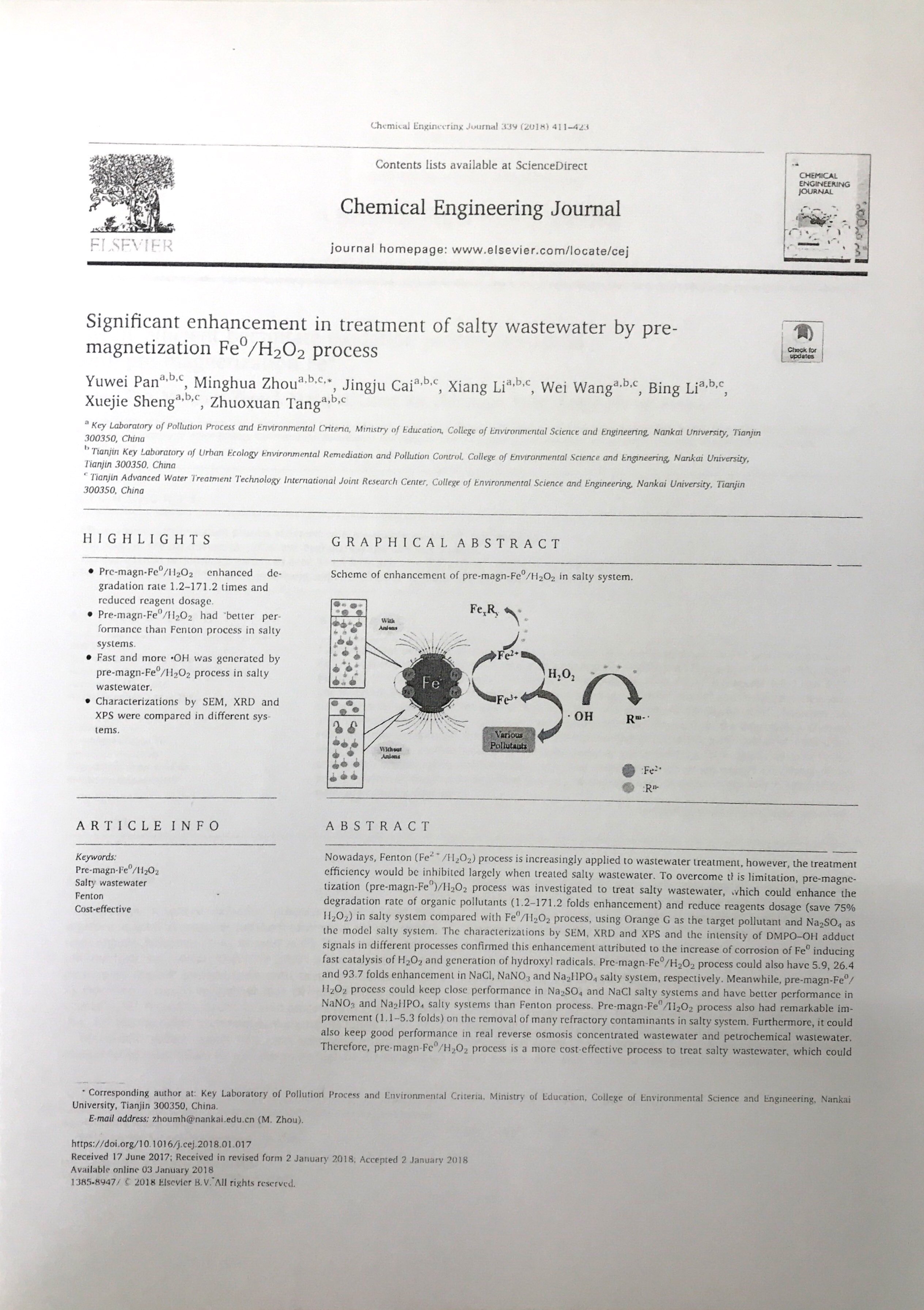 2018年6月:2018年南开大学环境科学与工程学院优秀论文奖