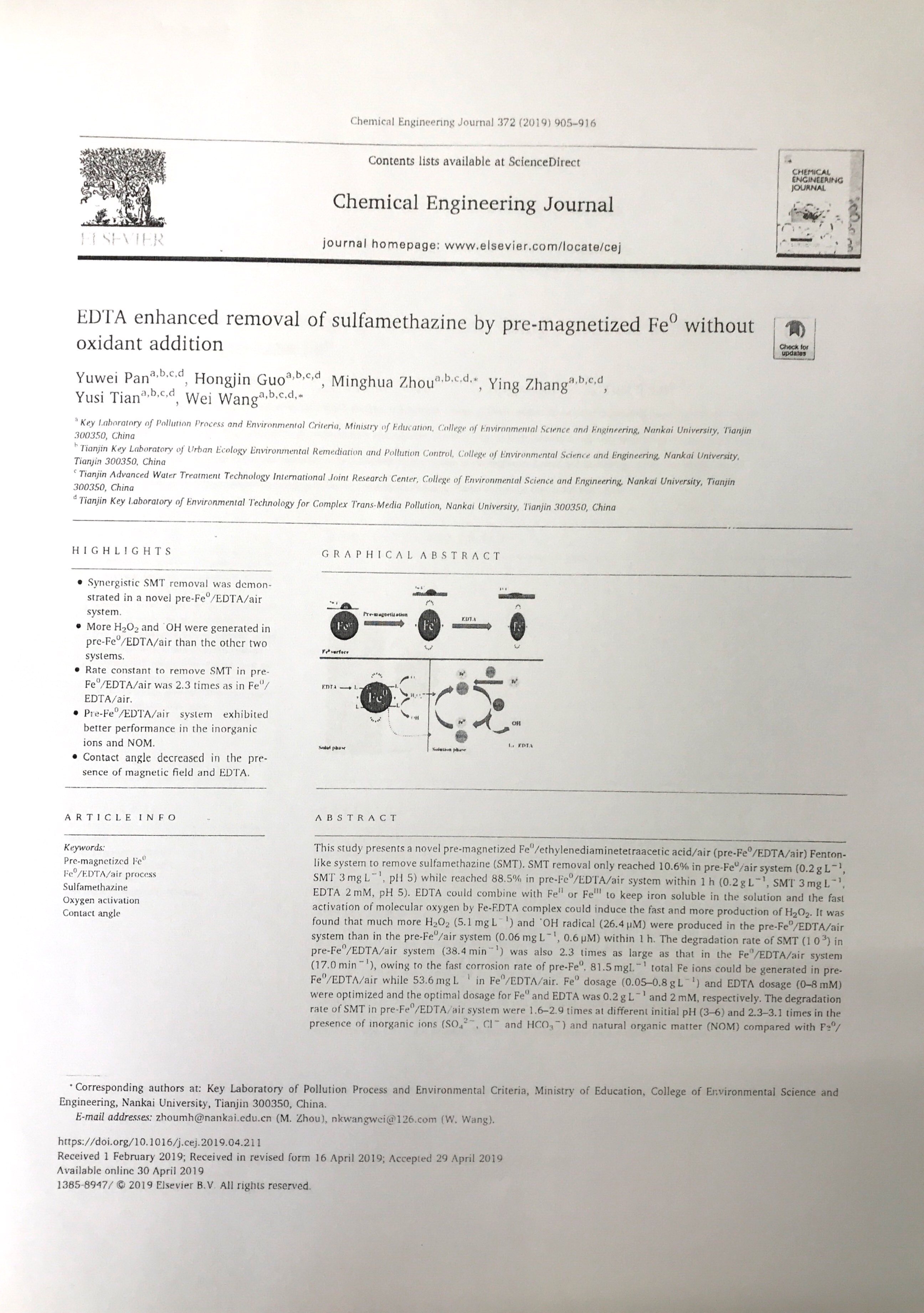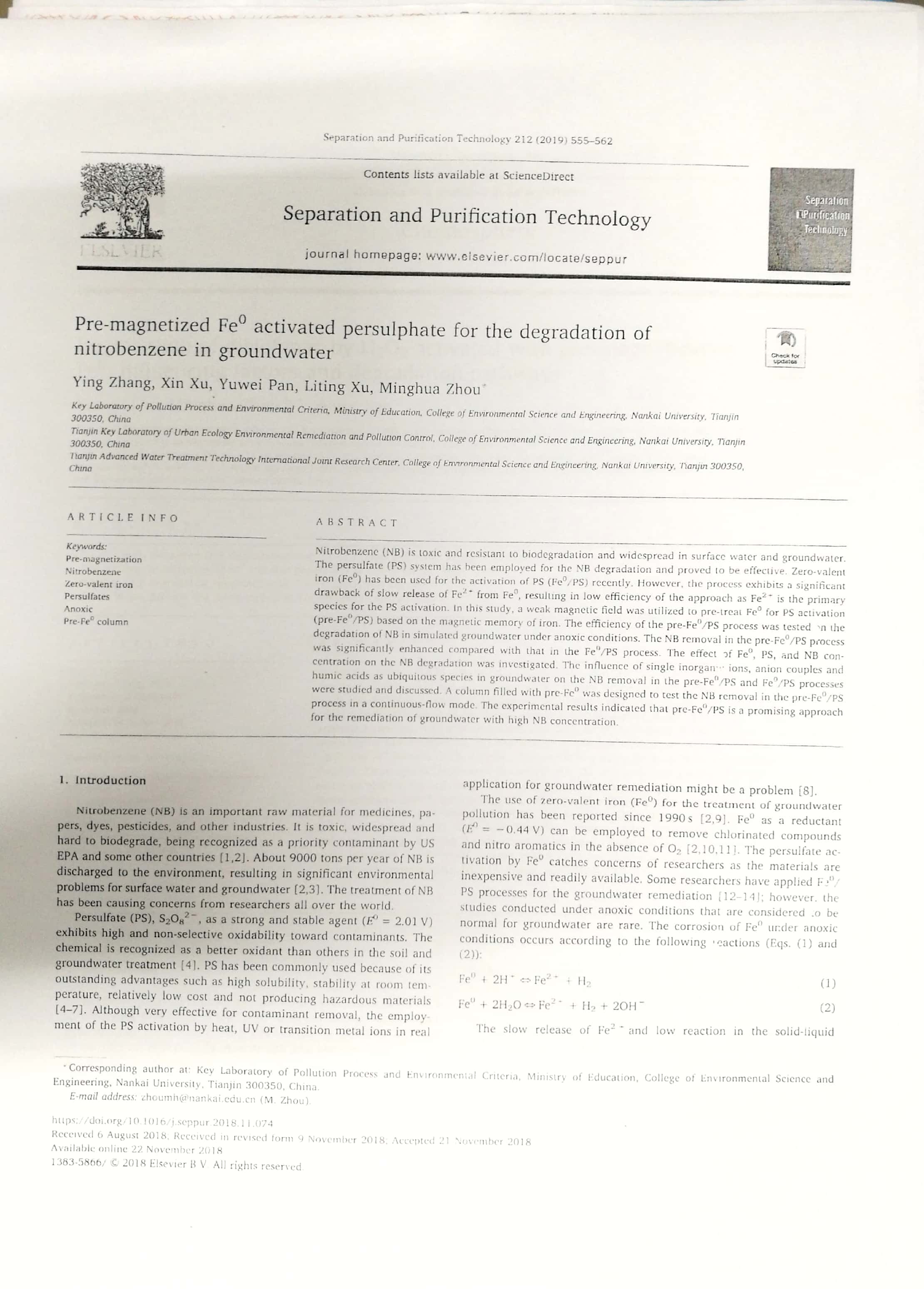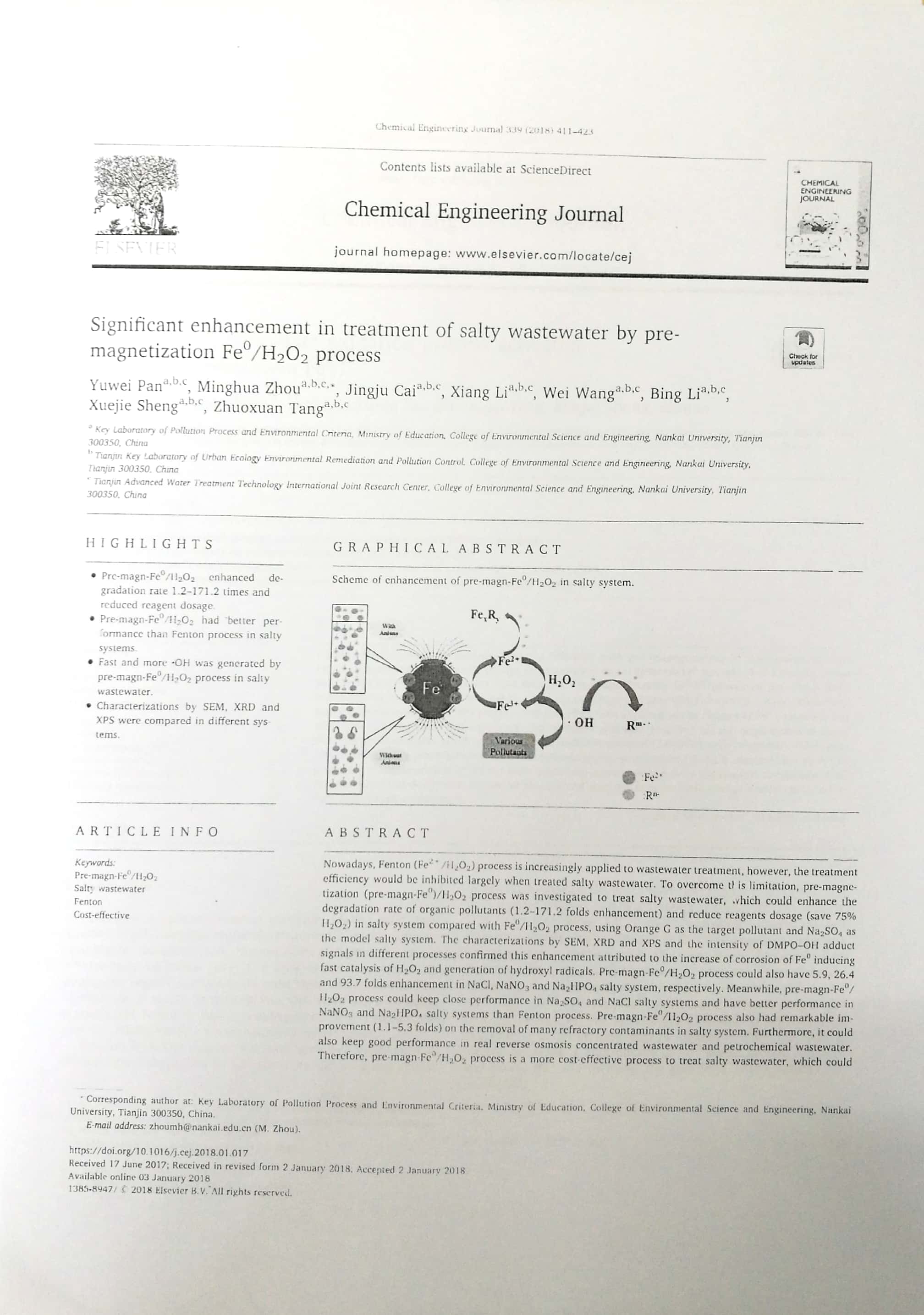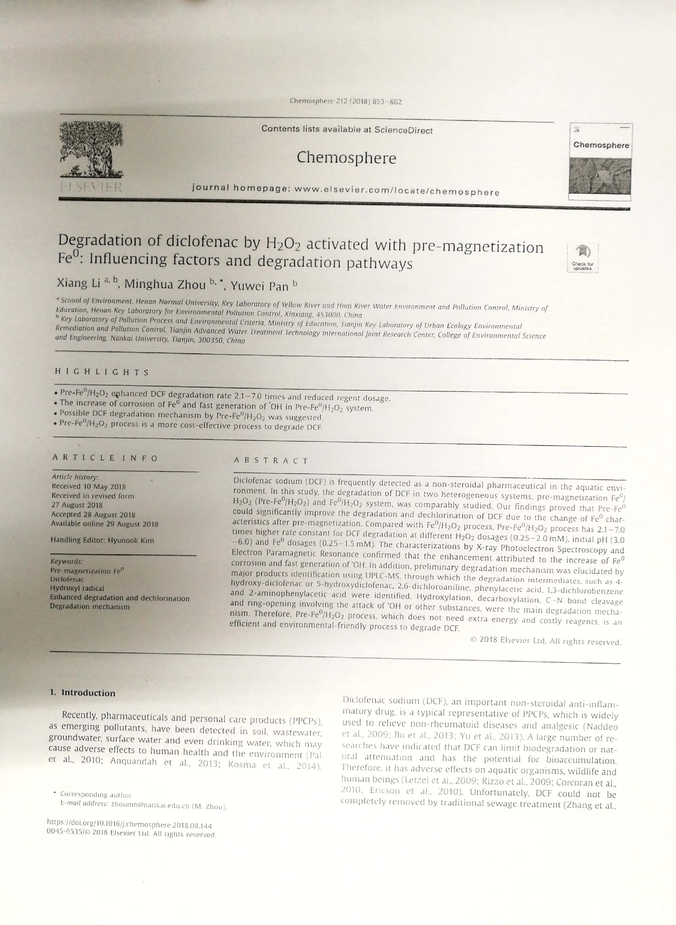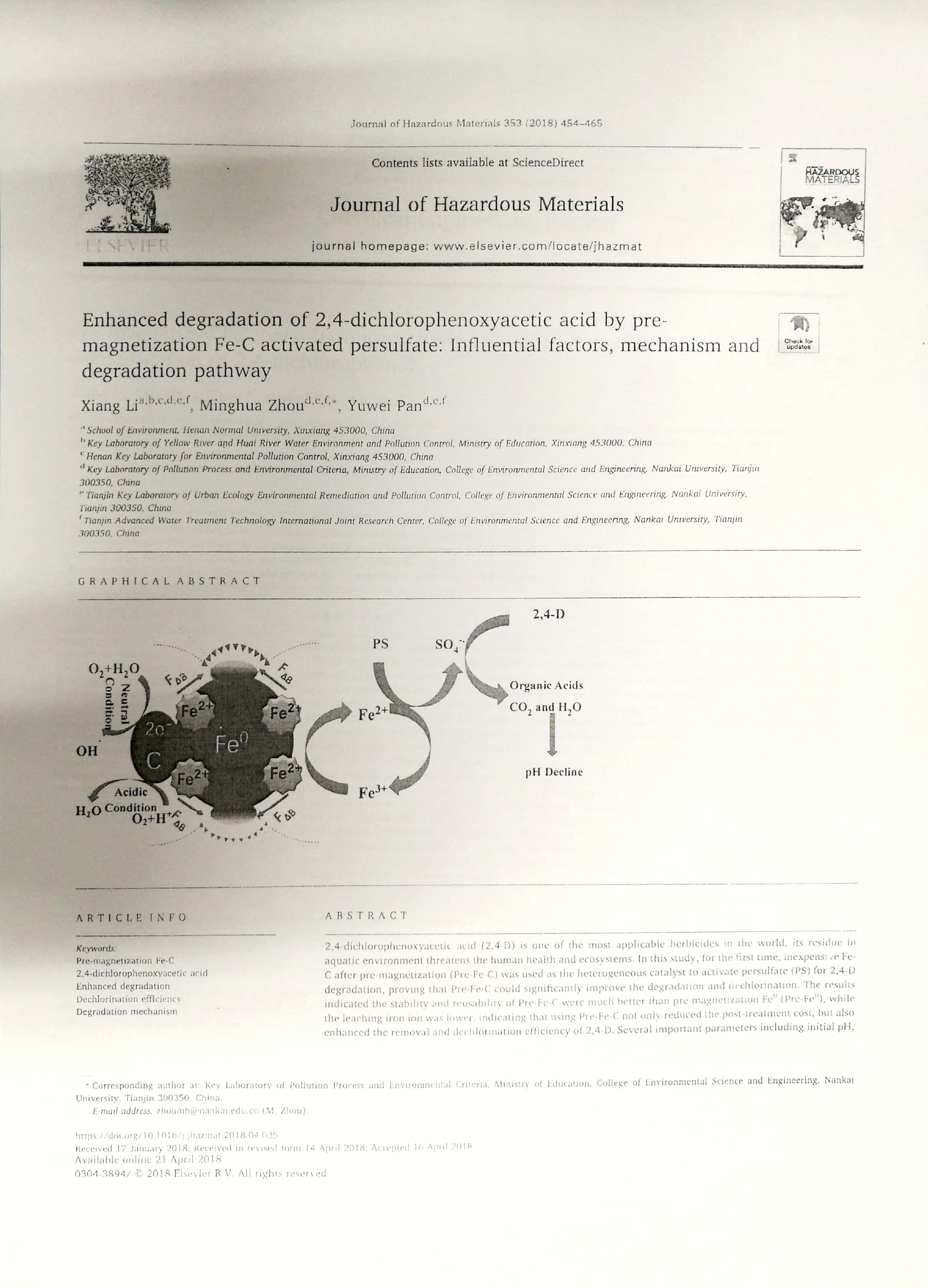2018年6月:2018年南开大学环境科学与工程学院优秀论文奖