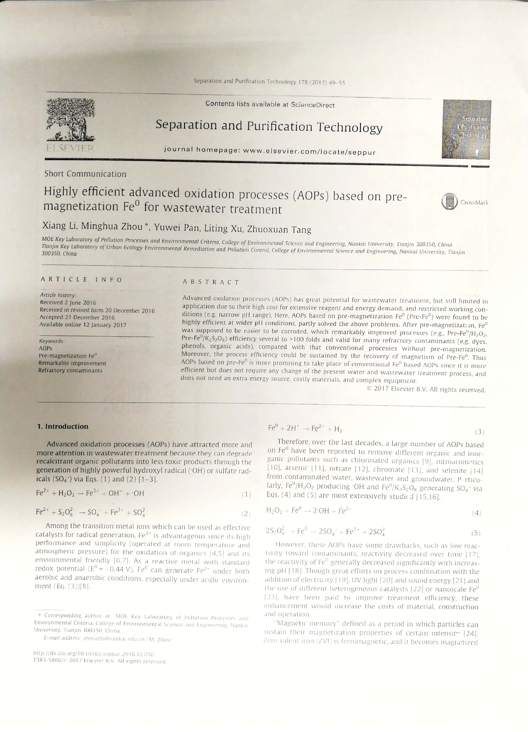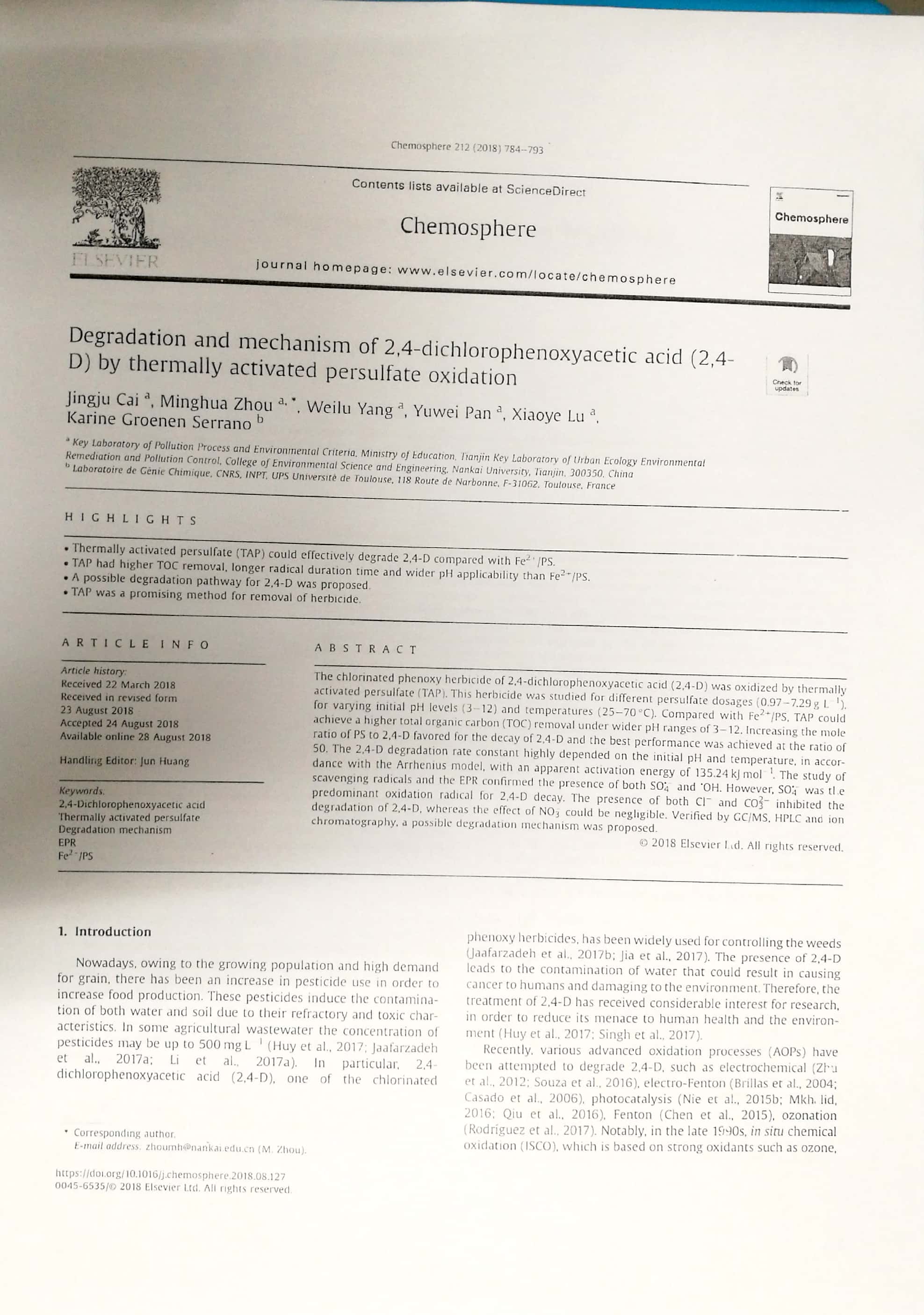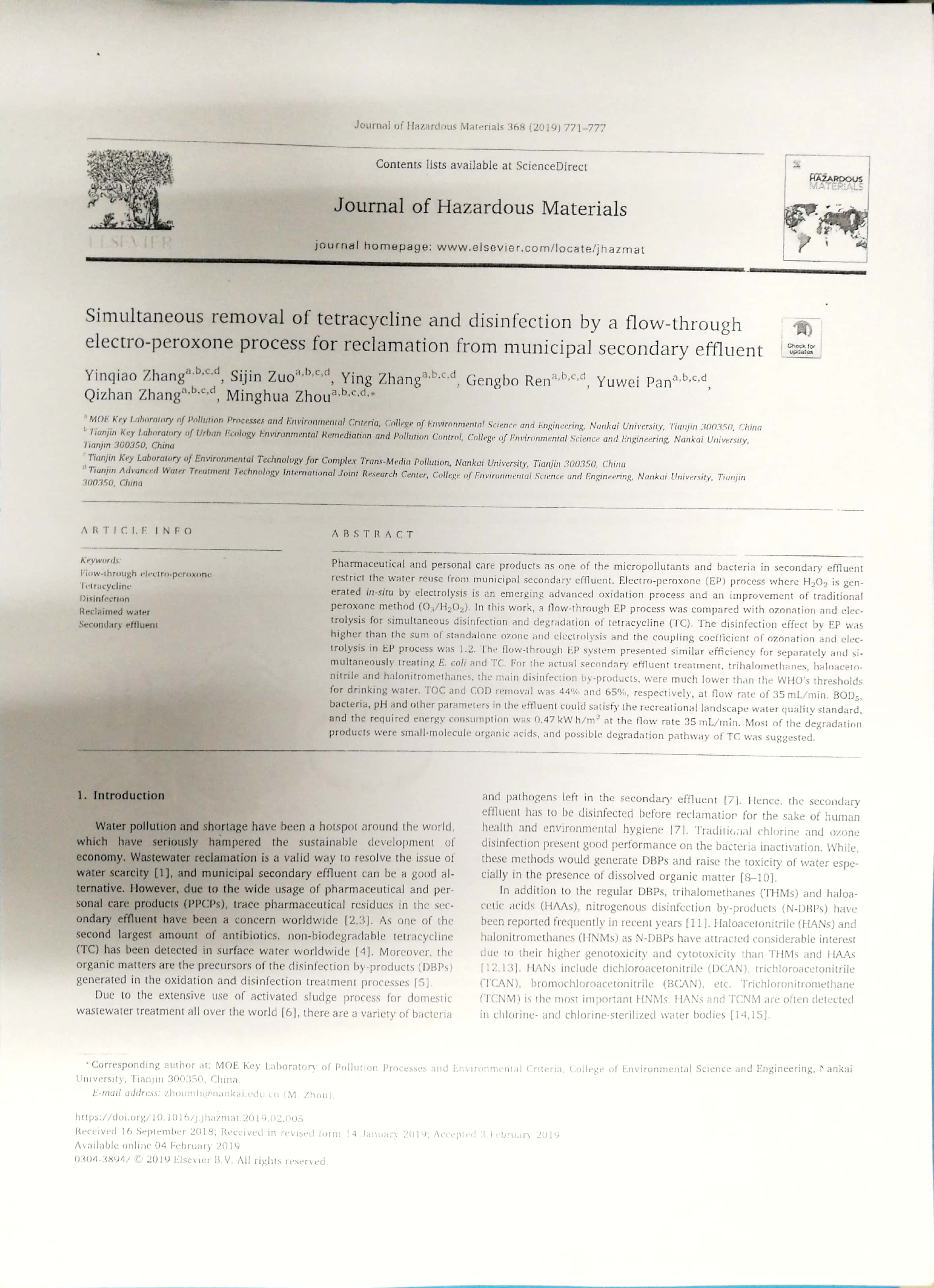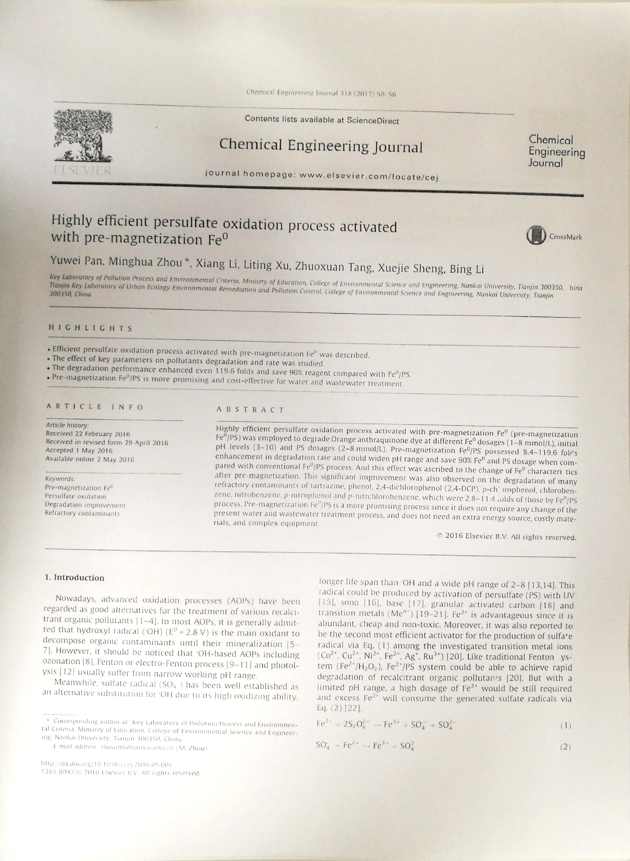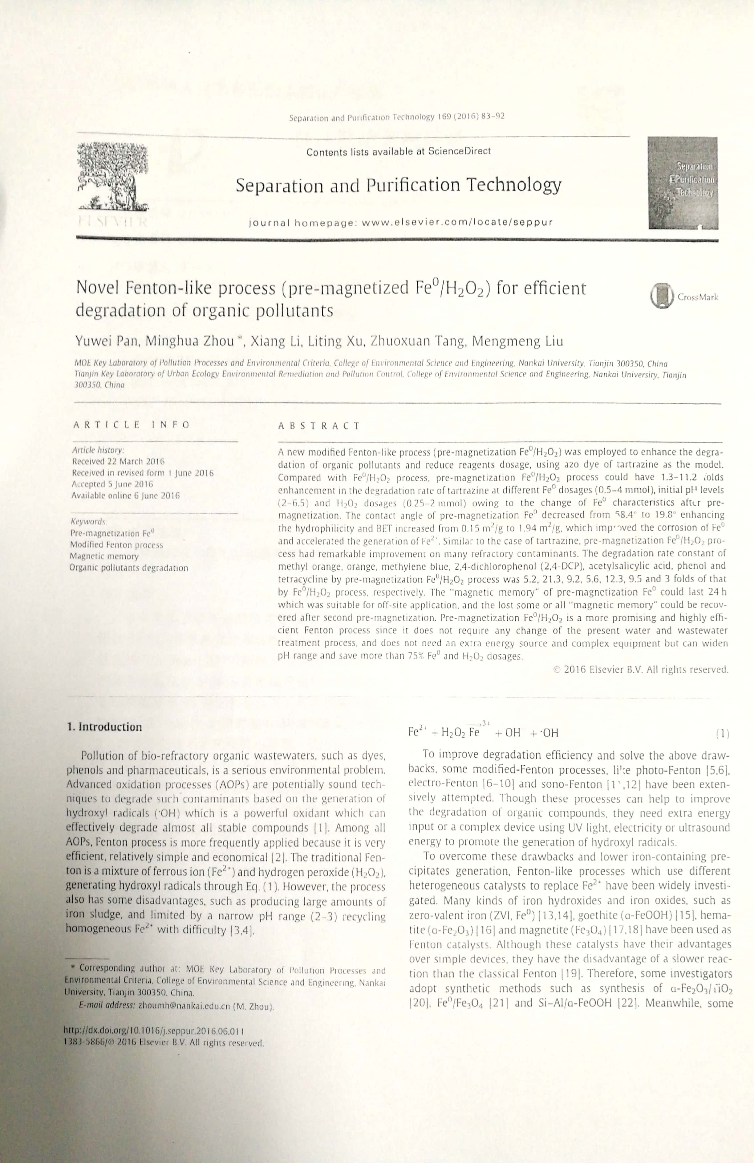 2018年6月:2018年南开大学环境科学与工程学院优秀论文奖