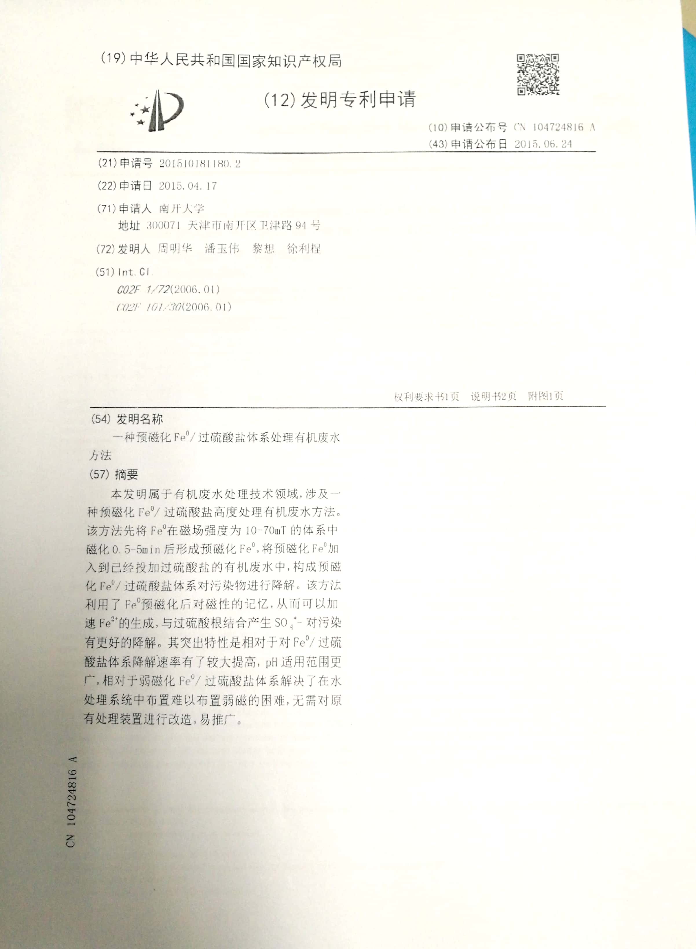 成果简介:潘玉伟同学目前发表SCI论文16篇,其中以第一作者发表SCI论文9篇,其中一区论文7篇,2区2篇,累积影响因子达到55.315;同时也以学生一作的身份申请了两项发明性专利。
