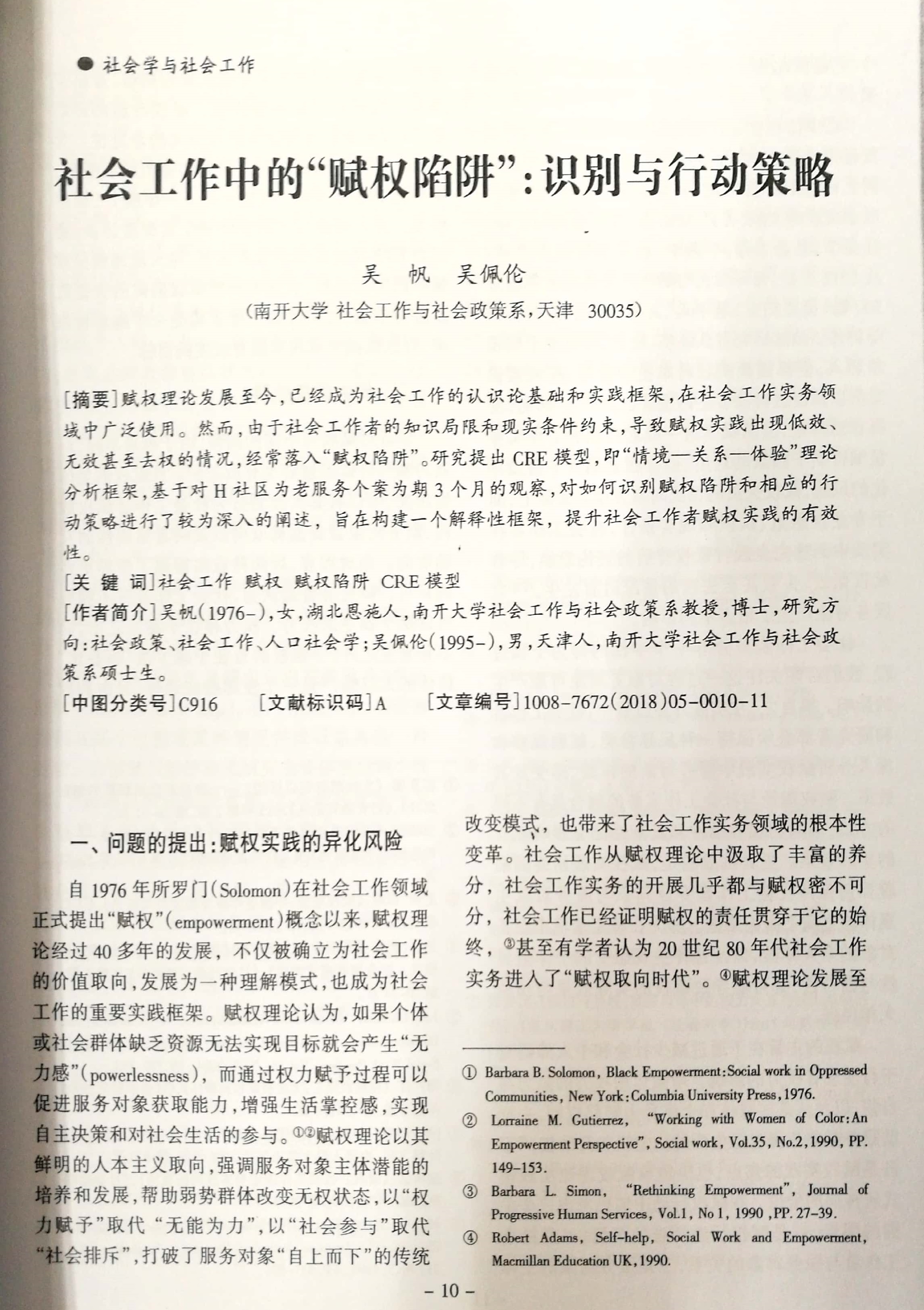 成果类型:论文类 成果简介:论文基于我国社会工作实务工作中的困境,提出CRE模型即“情景—关系—体验”理论分析框架,对如何识别社会工作赋权陷阱和相应的行动进行了较为深入的阐述。 所属人简介:南开大学研究生优秀毕业生;南开大学研究生优秀共产党员;南开大学一等奖学金。参与国家社科基金课题“中国当代家庭代际关系功能调查”;“中国城市社区发展转型调查研究”,担任调研督导。。