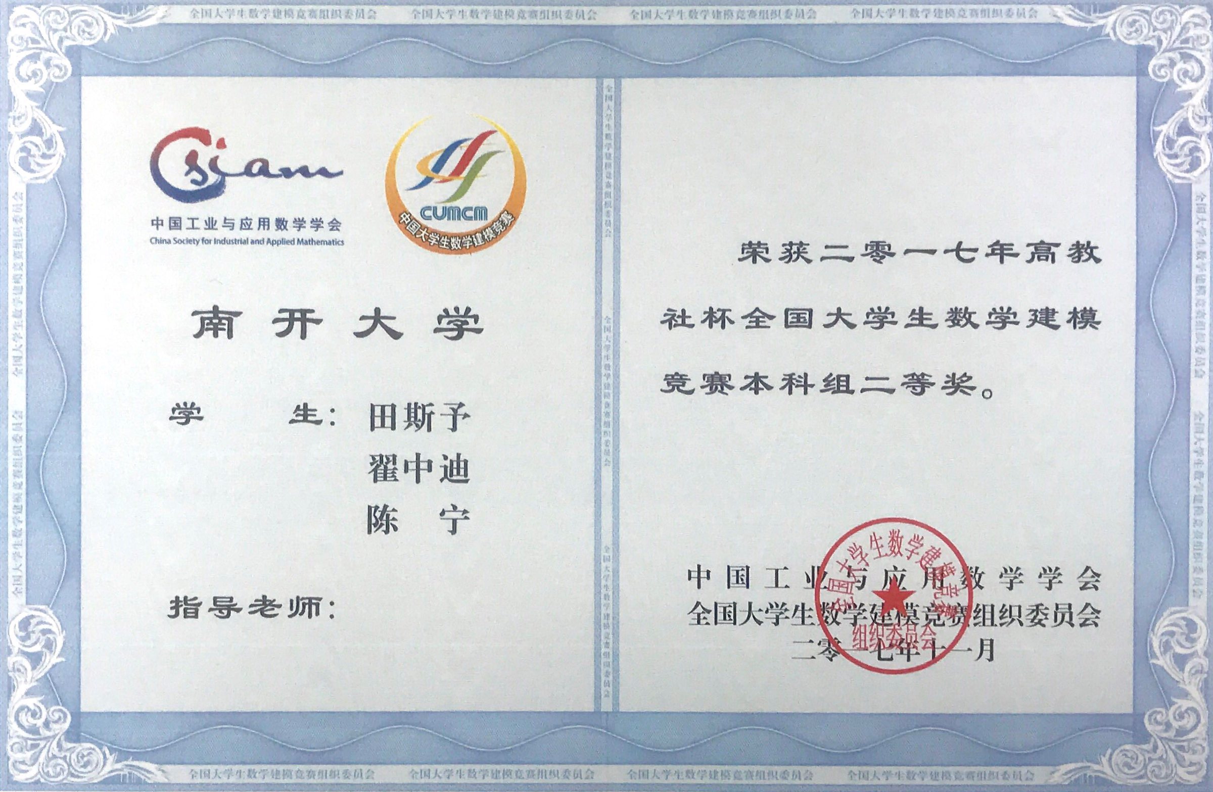 【高教社杯全国大学生数学建模竞赛本科组二等奖证书】