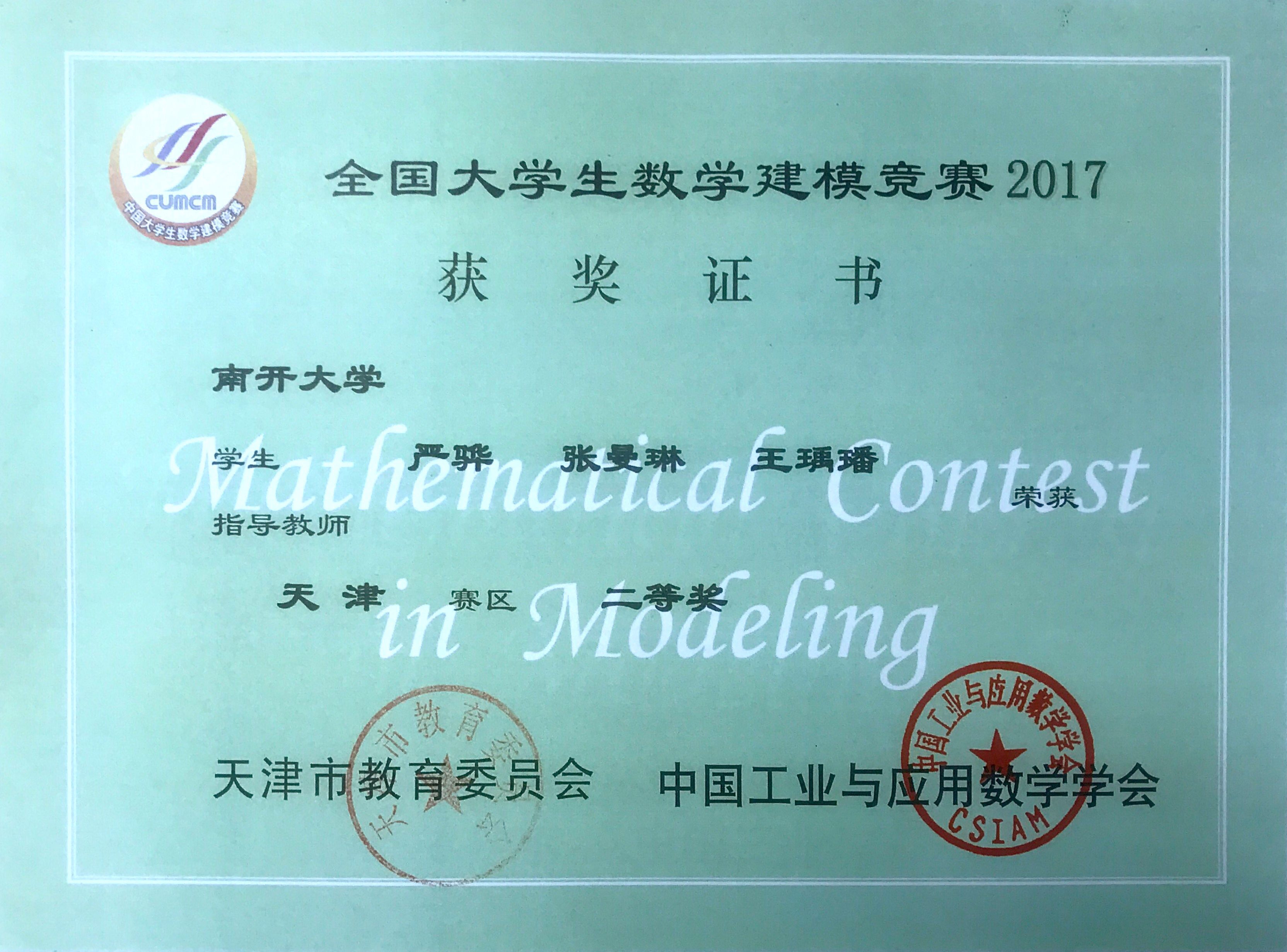 成果类型:证书类 成果简介:软件学院15级本科生严骅于2017年全国大学生数学建模竞赛中获天津赛区二等奖 所属人简介:曾获两次国家励志奖学金、一次公能奖学金、国赛省级二等奖、美赛H奖