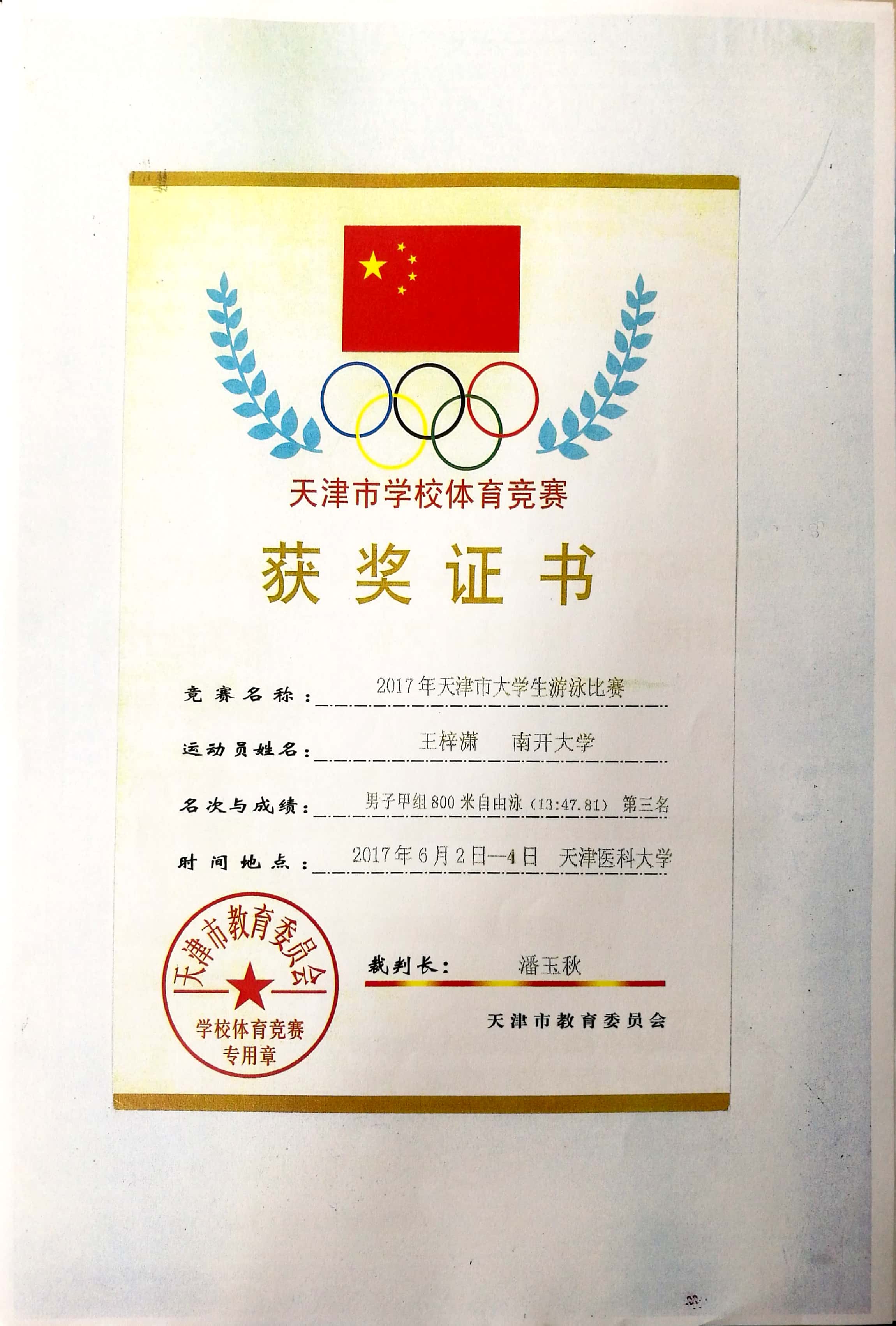 成果简介:2017年天津市大学生游泳比赛800米自由泳第三名