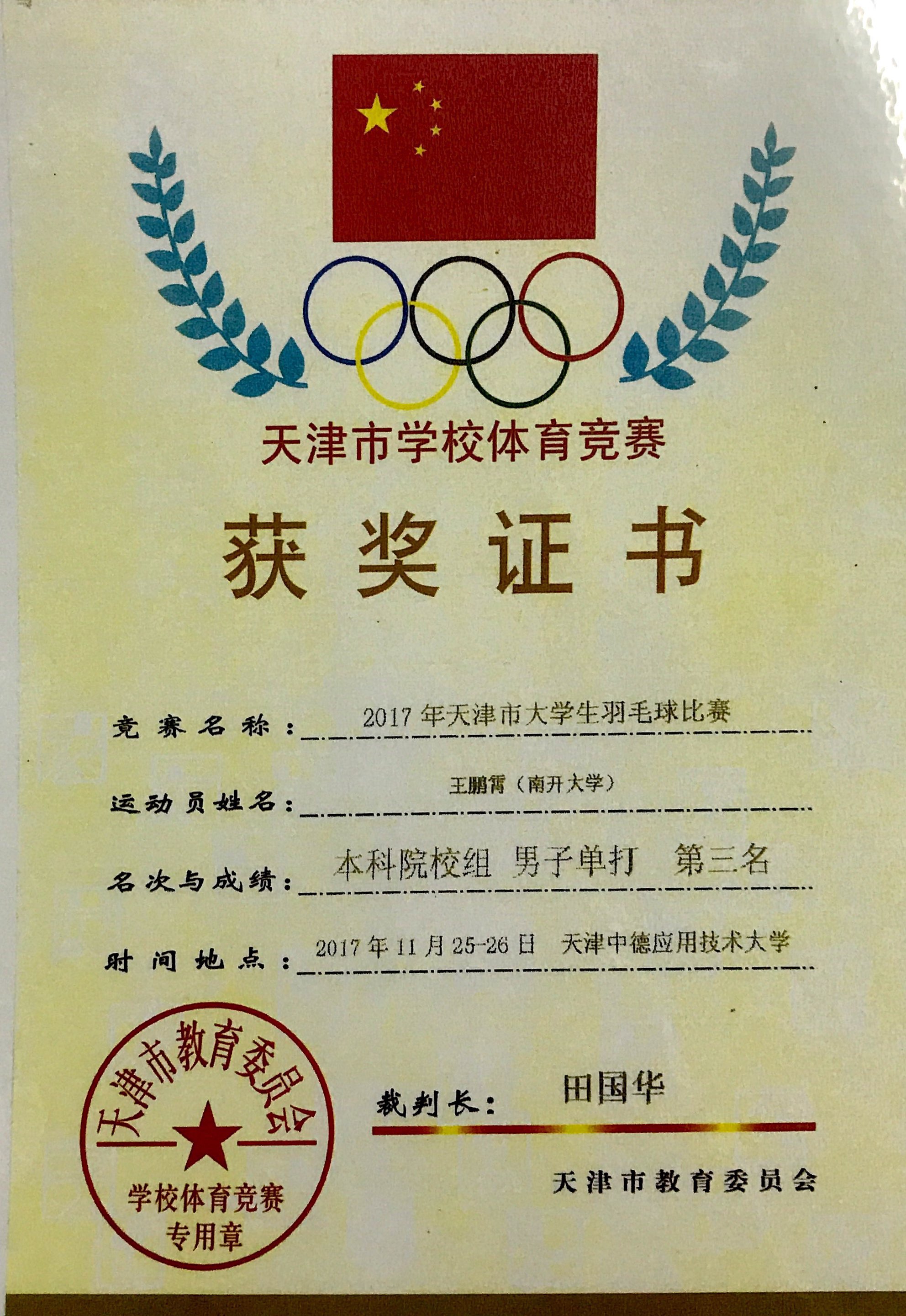 成果类型:证书类 成果简介:2017年天津市大学生羽毛球赛男子单打第三名 所属人简介:国家奖学金,南开大学三好学生,南开大学优秀学生干部;专业成绩名列前茅,连续三年获得奖学金