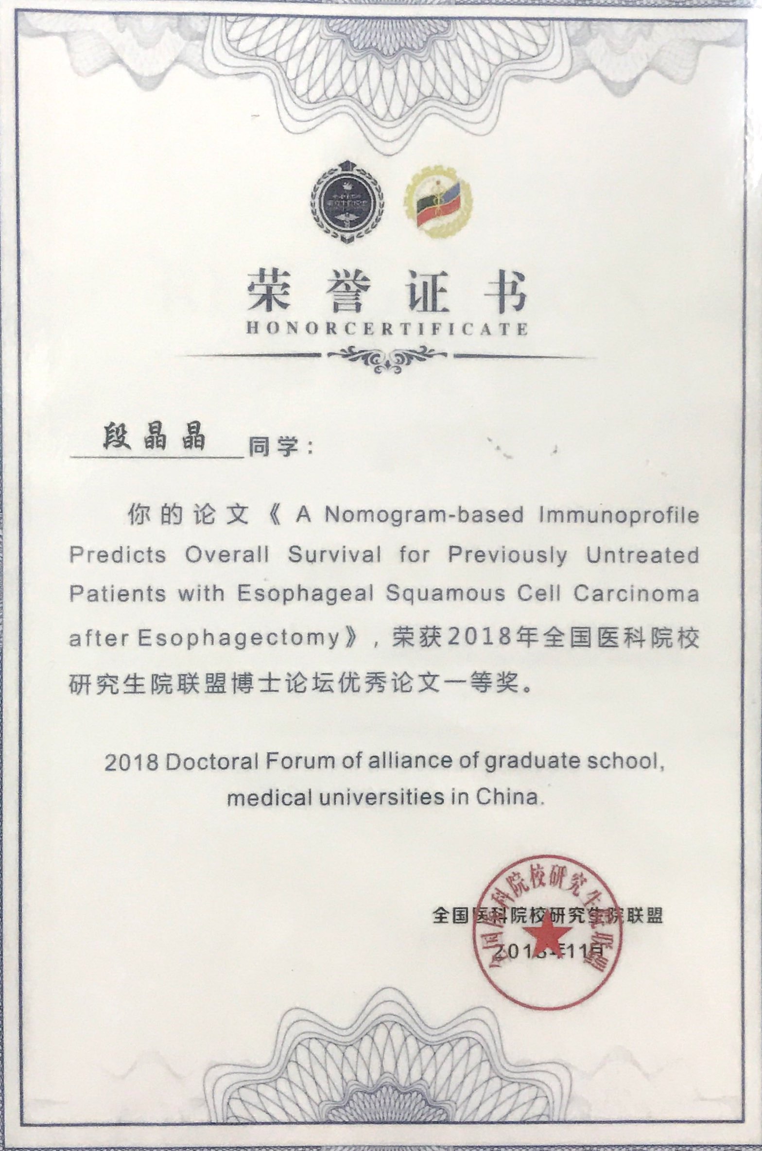 成果类型:证书类 成果简介:段晶晶同学学术论文《A nomogram-based immunoprofile predicts overall survival for previously untreated patients with esophageal squamous cell carcinoma after esophagectomy》荣获2018年全国医科院校研究生联盟博士论坛优秀论文一等奖 所属人简介:全国医科院校研究生联盟博士论坛优秀论文一等奖