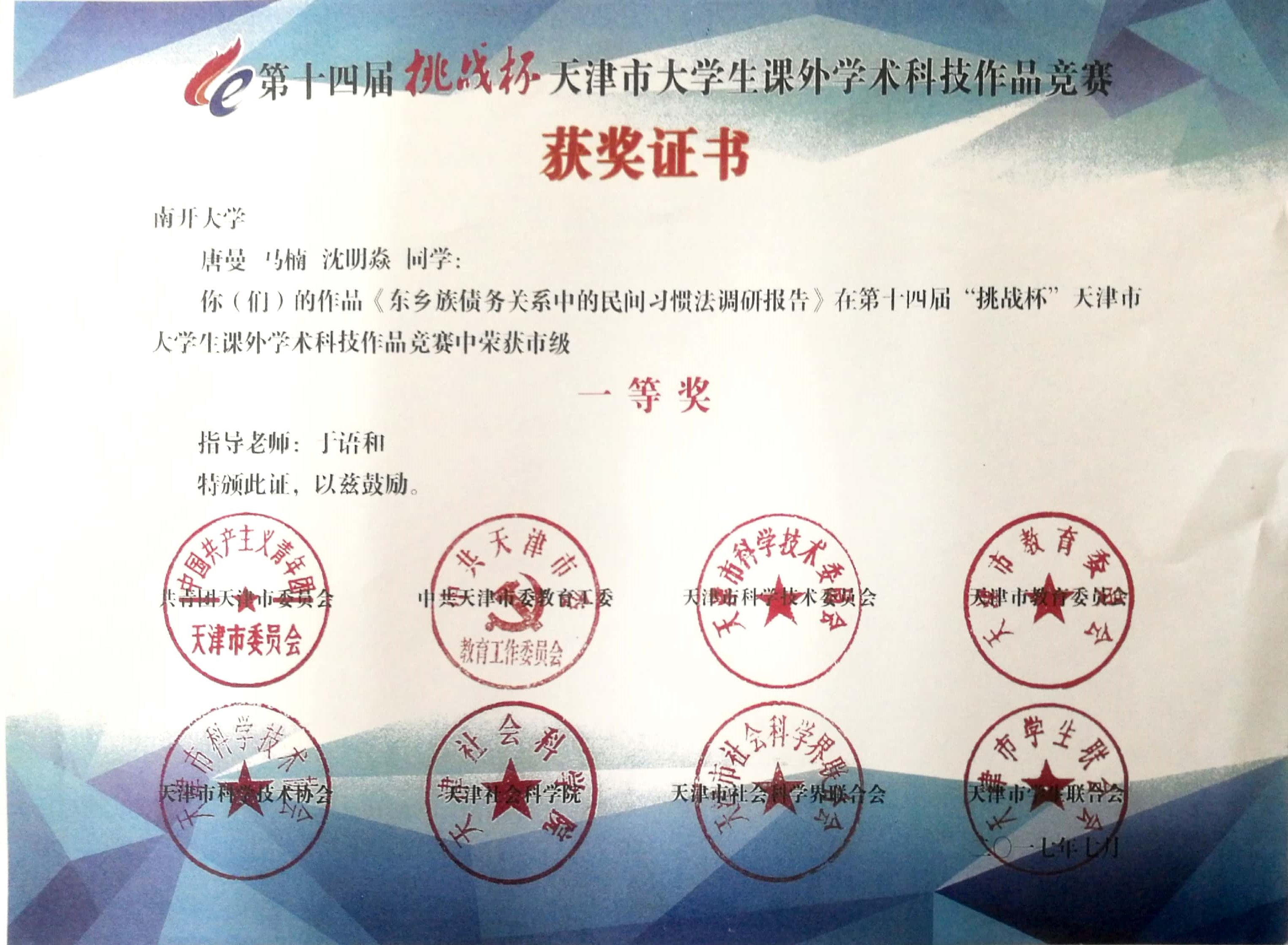 成果类型:证书类 成果简介:第十四届“挑战杯”天津市大学生课外学术科技作品一等奖 所属人简介:2018年硕士研究生国家奖学金,第十四届“挑战杯”天津市大学生课外学术科技作品一等奖,优秀毕业生,2017-2018年度优秀共产党员,2017-2018法学院江平击水奖学金;《南开法律评论》优秀编辑。本科(2013-2017):南开大学法学院法学专业;硕士(2017-2019):南开大学法学院民商法专业(校内保研)。现被录取为清华大学2019级民法博士。