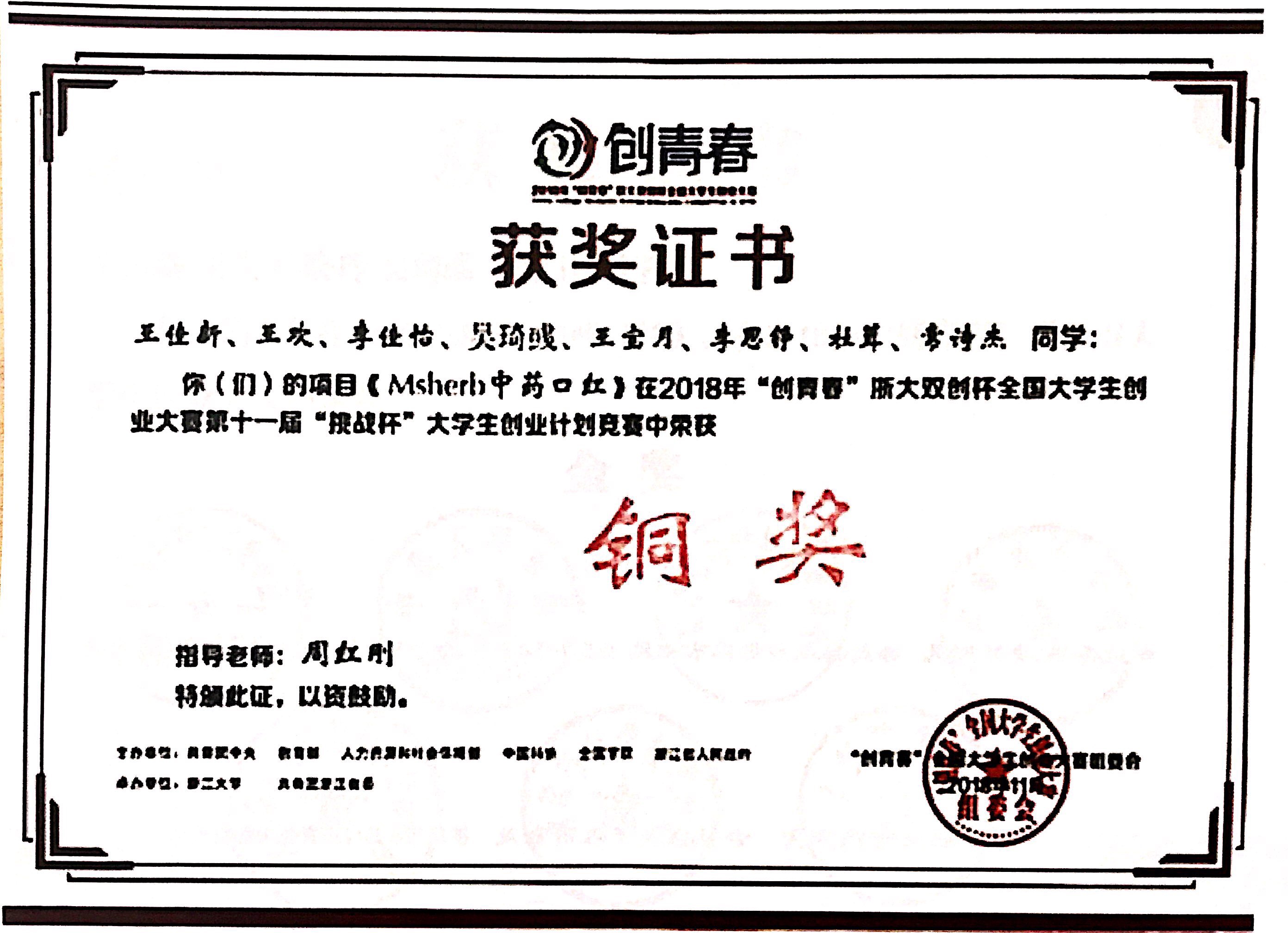 全国创青春比赛铜奖证书