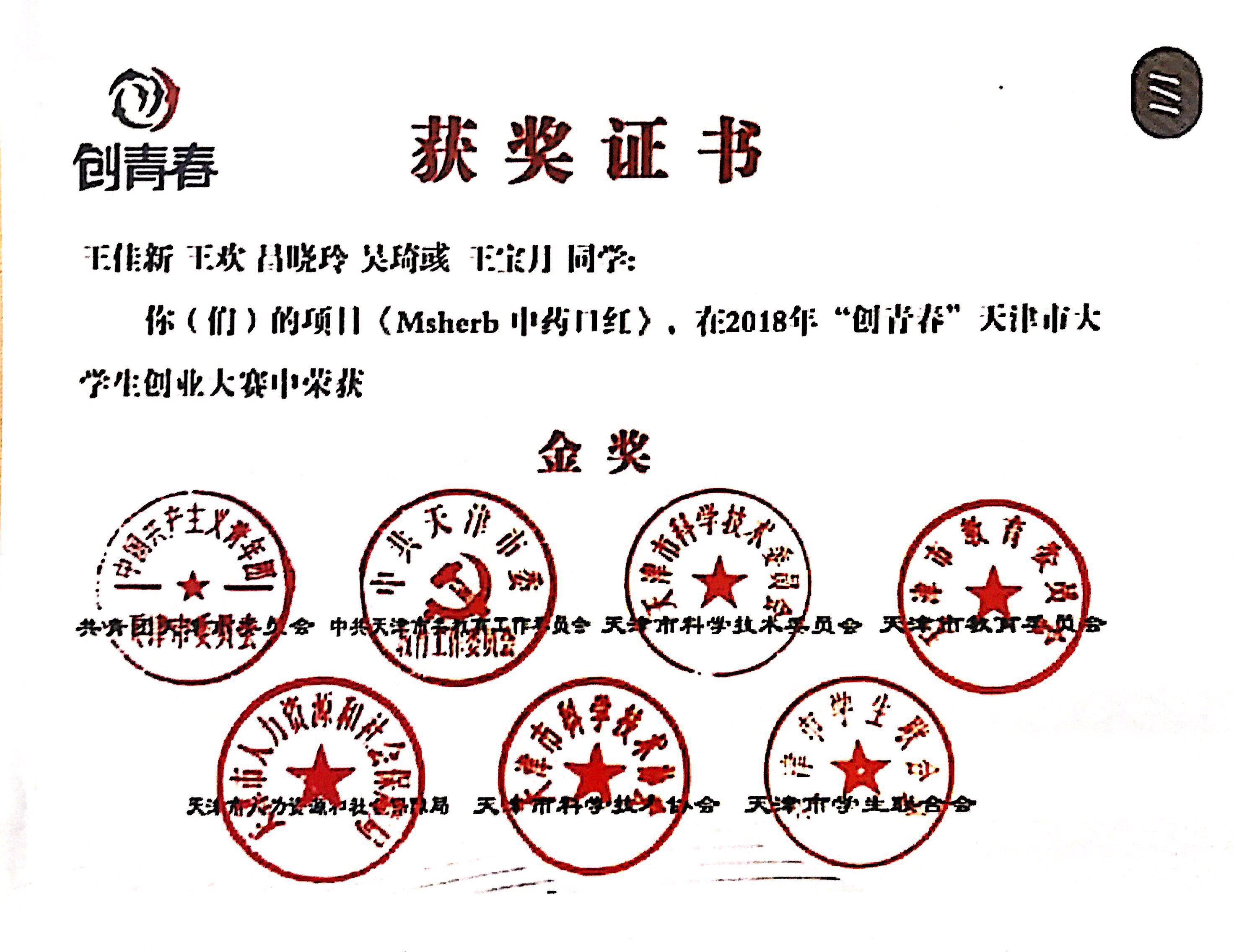 【天津市创青春比赛金奖证书】
