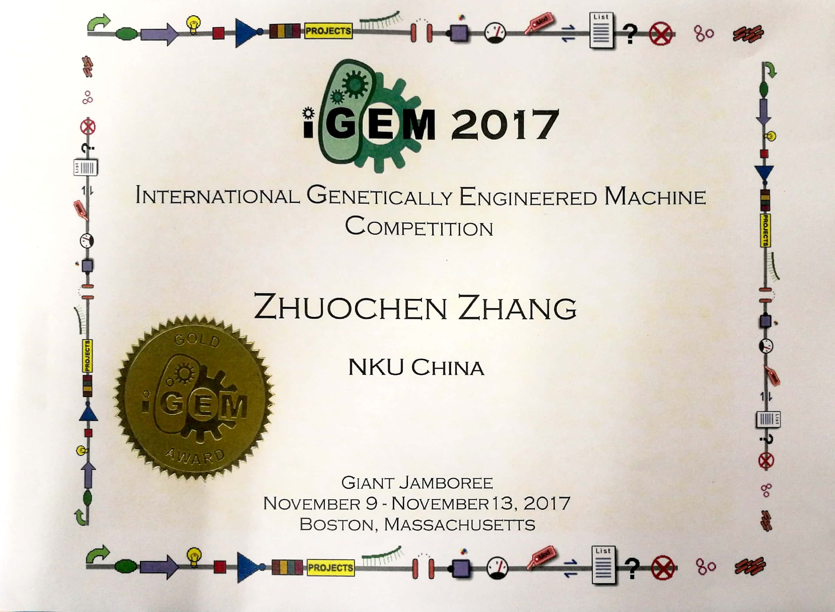 成果类型:证书类 成果简介:该证书为张卓晨随iGEM团队在2017年国际遗传机器设计大赛上的金奖获奖证书 所属人简介:“化联杯”化学知识与实验技能竞赛优秀奖2015-2016学年度公能奖学金天津市生命科学基本实验技能竞赛三等奖国际遗传机器设计大赛(iGEM)南开代表队金奖南开大学本科生创新科研计划优秀项目优秀奖2017-2018学年度公能奖学金作为南开大学代表队成员参加2017年国际遗传机器设计大赛并获金奖