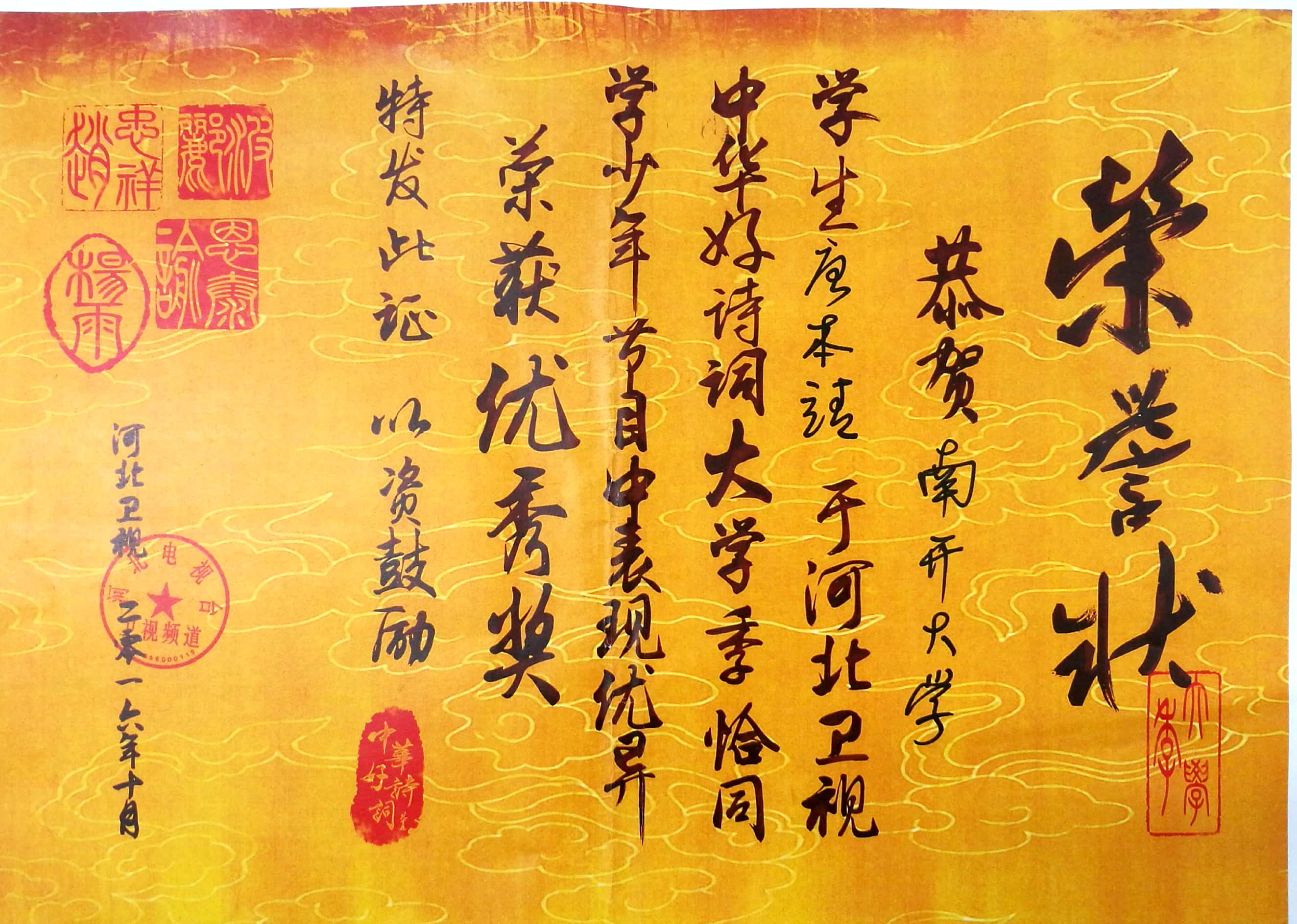 成果类型:证书类 成果简介:河北卫视主办的2016年高校诗词知识联赛荣誉证书 所属人简介:曾获国家励志奖学金、校级“三好学生”、“优秀学生干部”;2017年全国大学生数学建模竞赛国家级一等奖;2018年第四届全国密码技术竞赛一等奖;樱花诗歌奖、邯郸诗歌奖、聂绀弩杯诗词奖等全国性文学奖项数十次。现保研至浙江大学计算机学院。