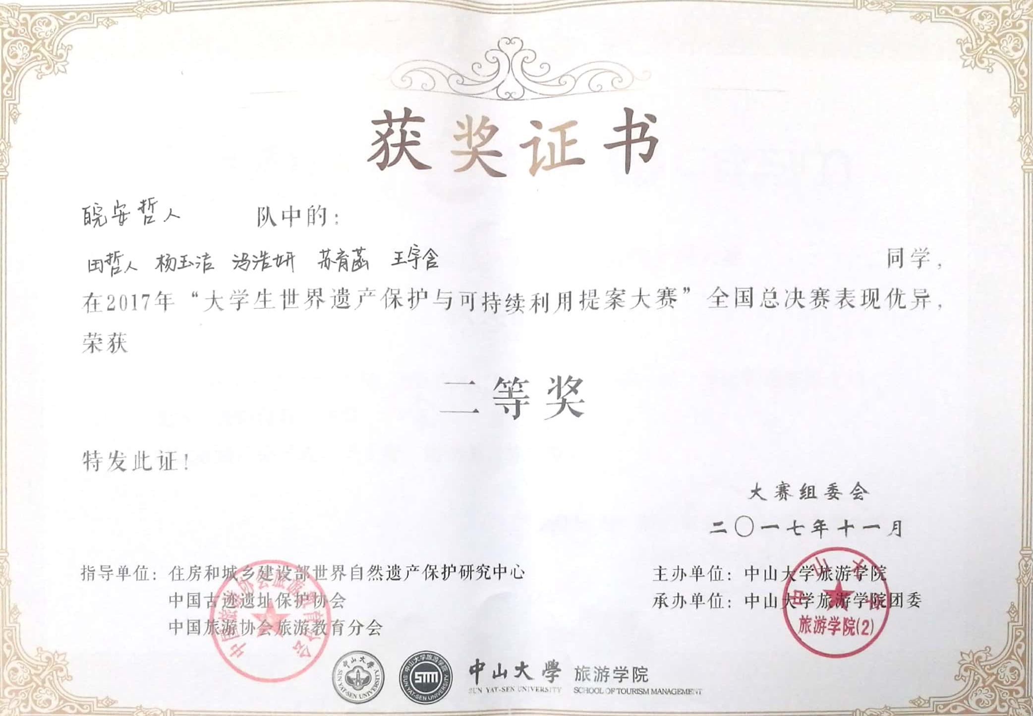 成果类型:证书类 成果简介:田哲人、苏育菡、杨玉洁、冯浩妍、王宇涵五位同学于2017年11月获得第六届全国大学生世界遗产保护论坛暨大学生世界遗产保护与可持续利用提案大赛二等奖 所属人简介:获全国大学生世界遗产保护论坛暨大学生世界遗产保护与可持续利用提案大赛二等奖;均获得奖学金等荣誉