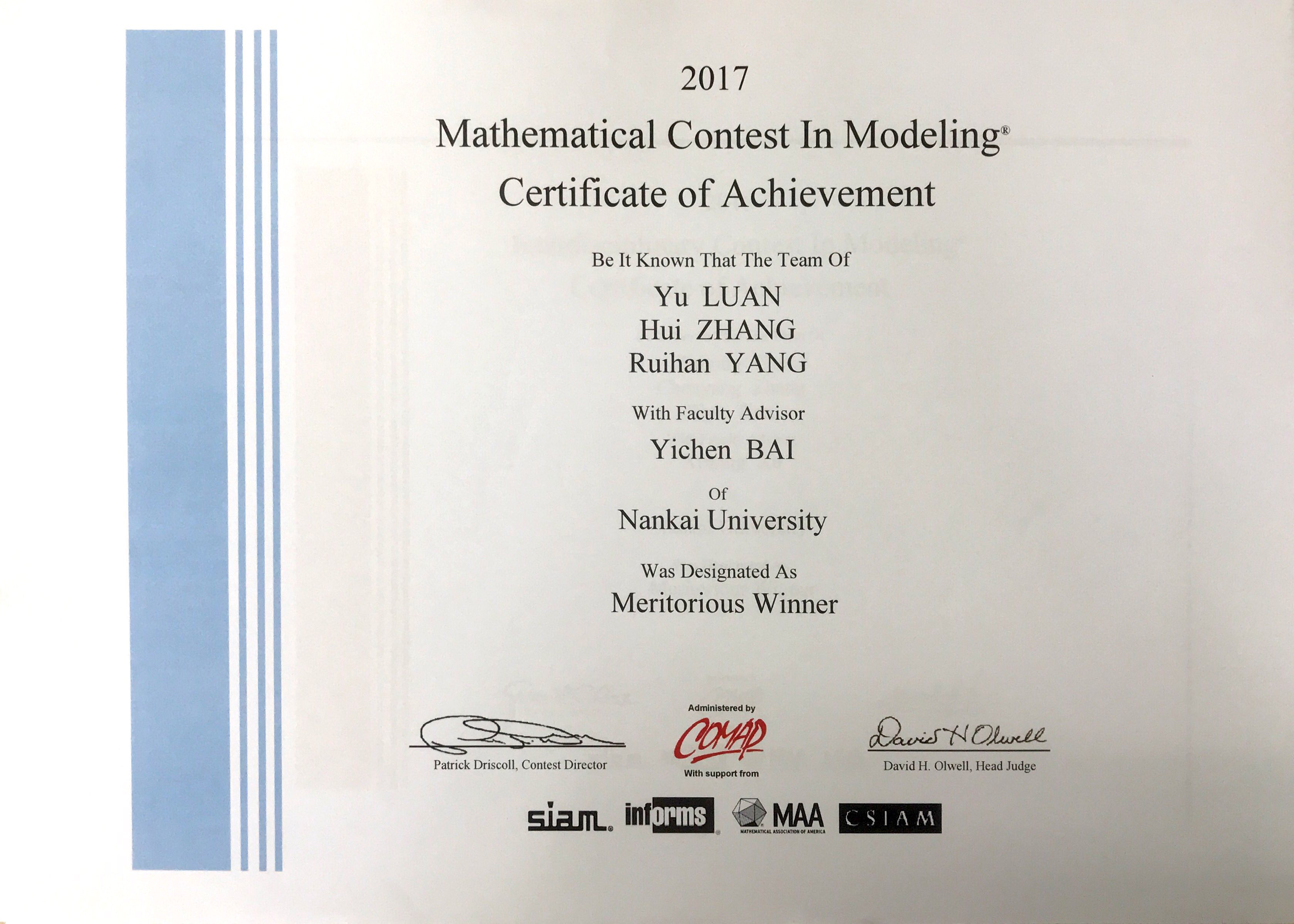 成果简介:软件学院15级本科生杨睿涵在2017年美赛中获M奖