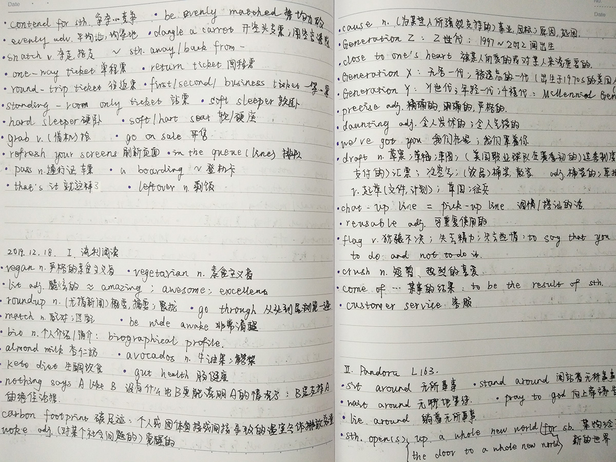成果简介:该笔记为张倩溶同学的课外英语自学笔记,具有字迹工整、分类清晰的特点。