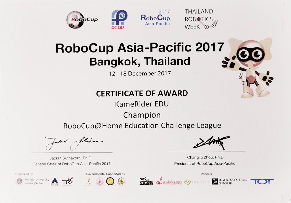 成果简介:该证书为KameRider团队在2017年参加RoboCup亚太赛家庭组EDU项目中所获荣誉,由团队成员共同努力,获得该奖项。