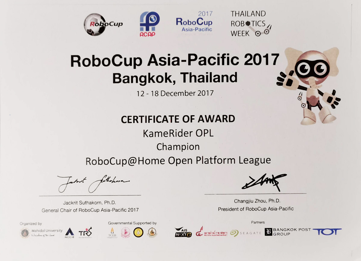 成果简介:该证书为KameRider团队在2017年参加RoboCup亚太赛家庭组OPL项目中所获荣誉,由团队成员共同努力,获得该奖项。