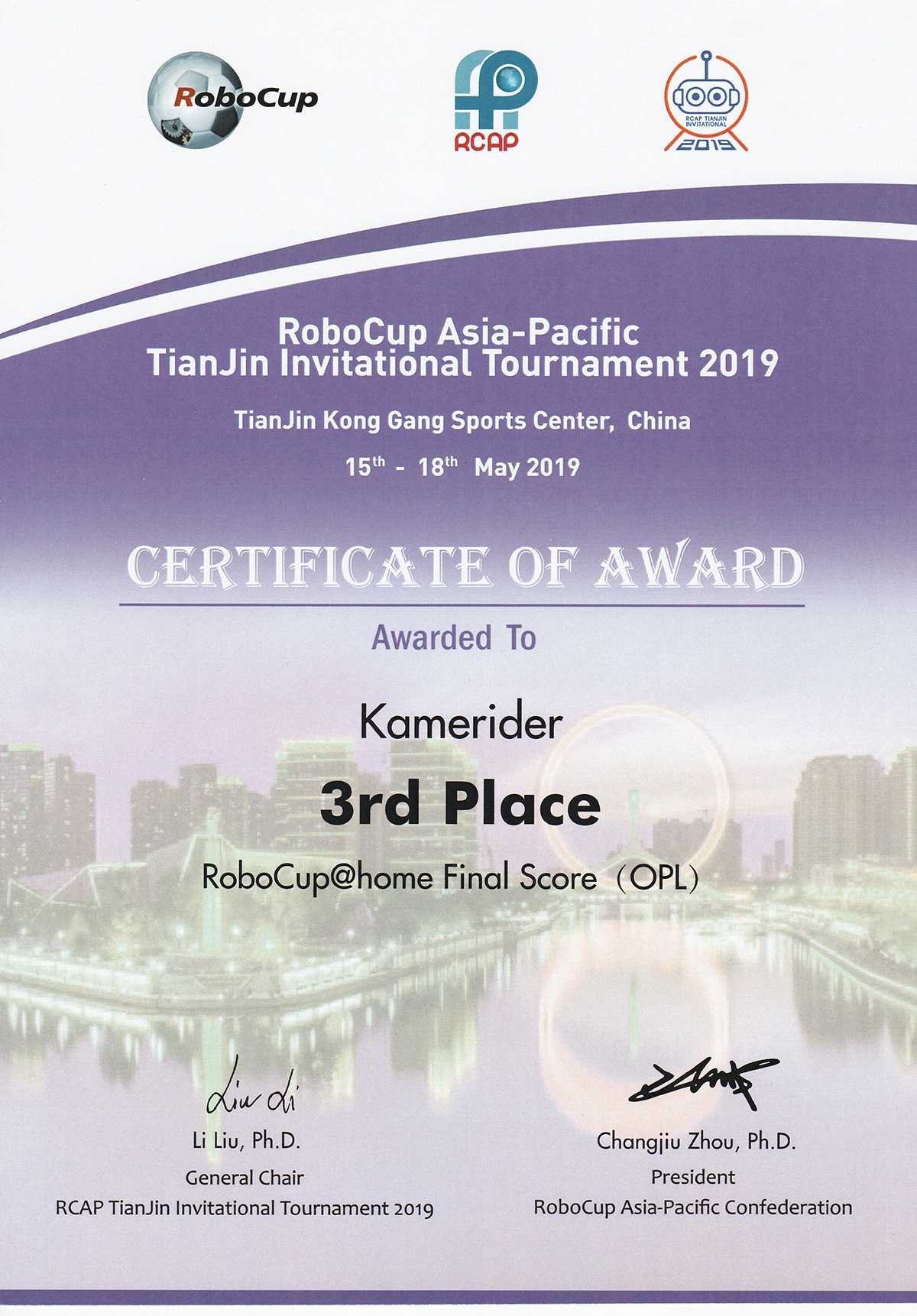 成果简介:该证书为KameRider团队在2019年参加RoboCup亚太邀请赛OPL项目中所获荣誉,由团队成员共同努力,获得该奖项。