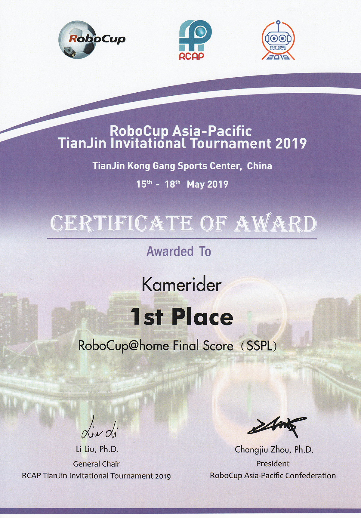 成果简介:该证书为KameRider团队在2019年参加RoboCup亚太邀请赛SSPL项目中所获荣誉,由团队成员共同努力,获得该奖项。