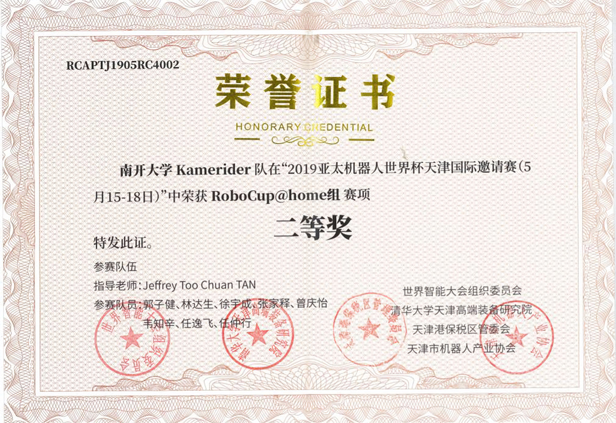 成果简介:该证书为KameRider团队在2019年参加RoboCup亚太邀请赛家庭组中所获荣誉,由团队成员共同努力,获得该奖项。