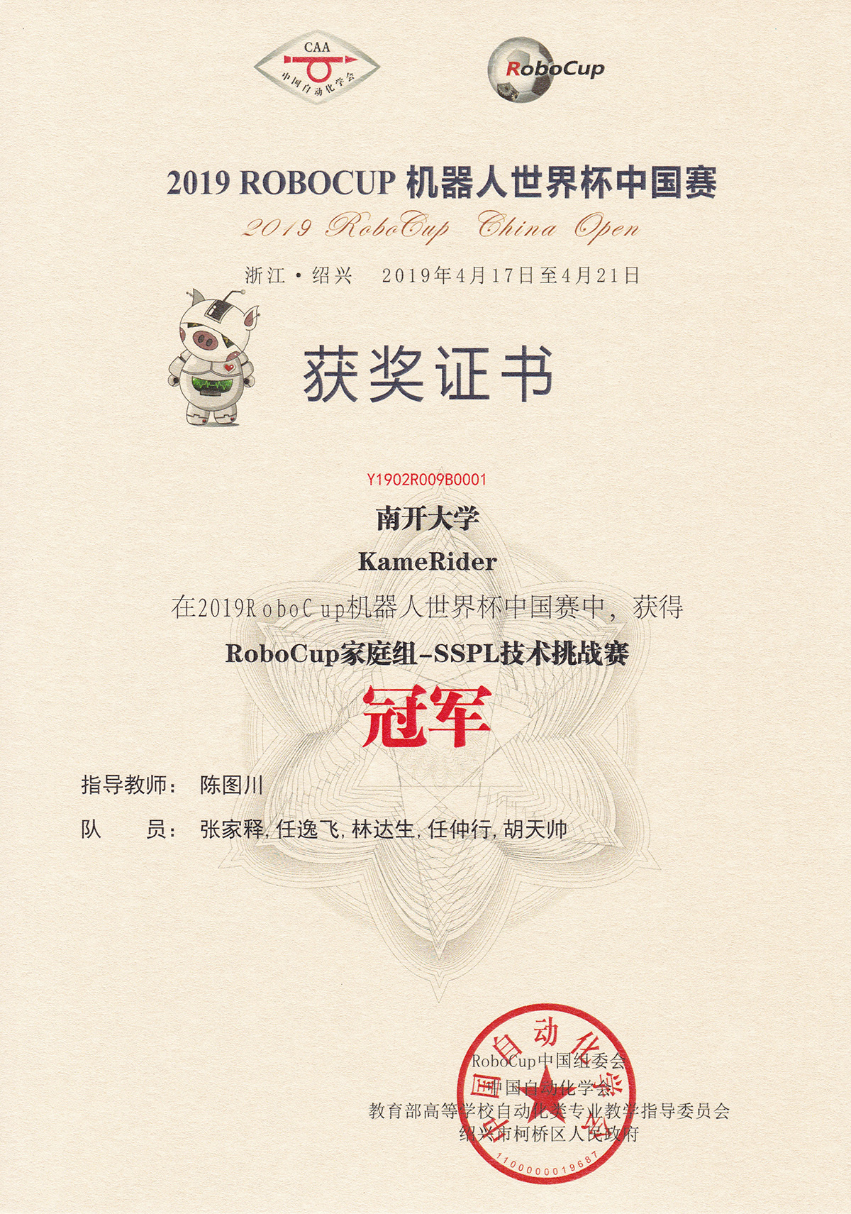 成果简介:该证书为KameRider团队在2019年参加RoboCup中国赛技术挑战赛SSPL项目中所获荣誉,由团队成员共同努力,获得该奖项。