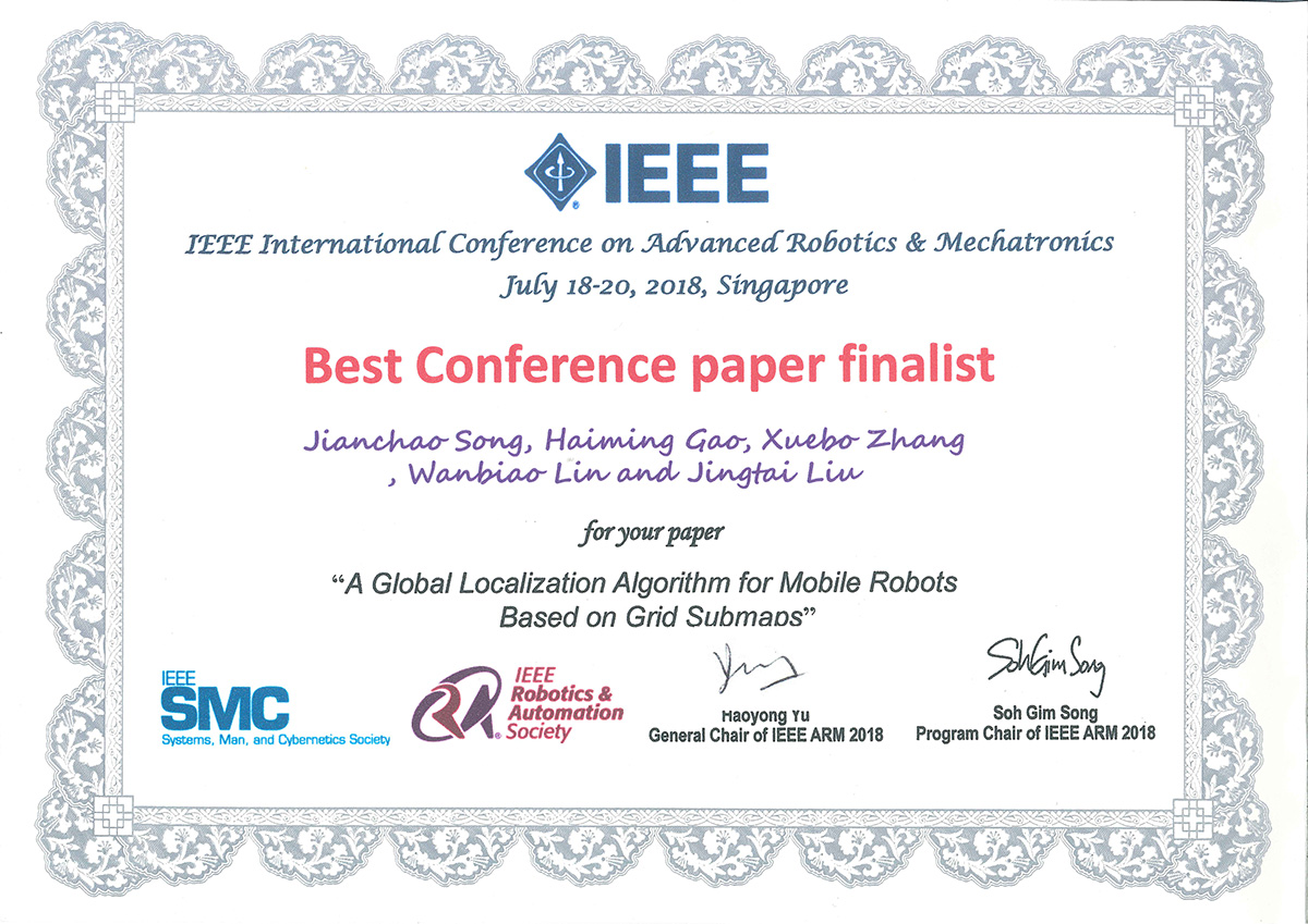 成果类型:求学成果展 成果简介:该文章为高海明同学发表在《IEEE Transactions on Instrumentation and Measurement》上的文章,该同学为第一作者,为了取得该学术成果,该生针对当前移动机器人全局定位领域成功率和效率均存在不足的问题,在对现有工作进行充分总结和归纳的基础上,提出了行之有效的全局定位方法。