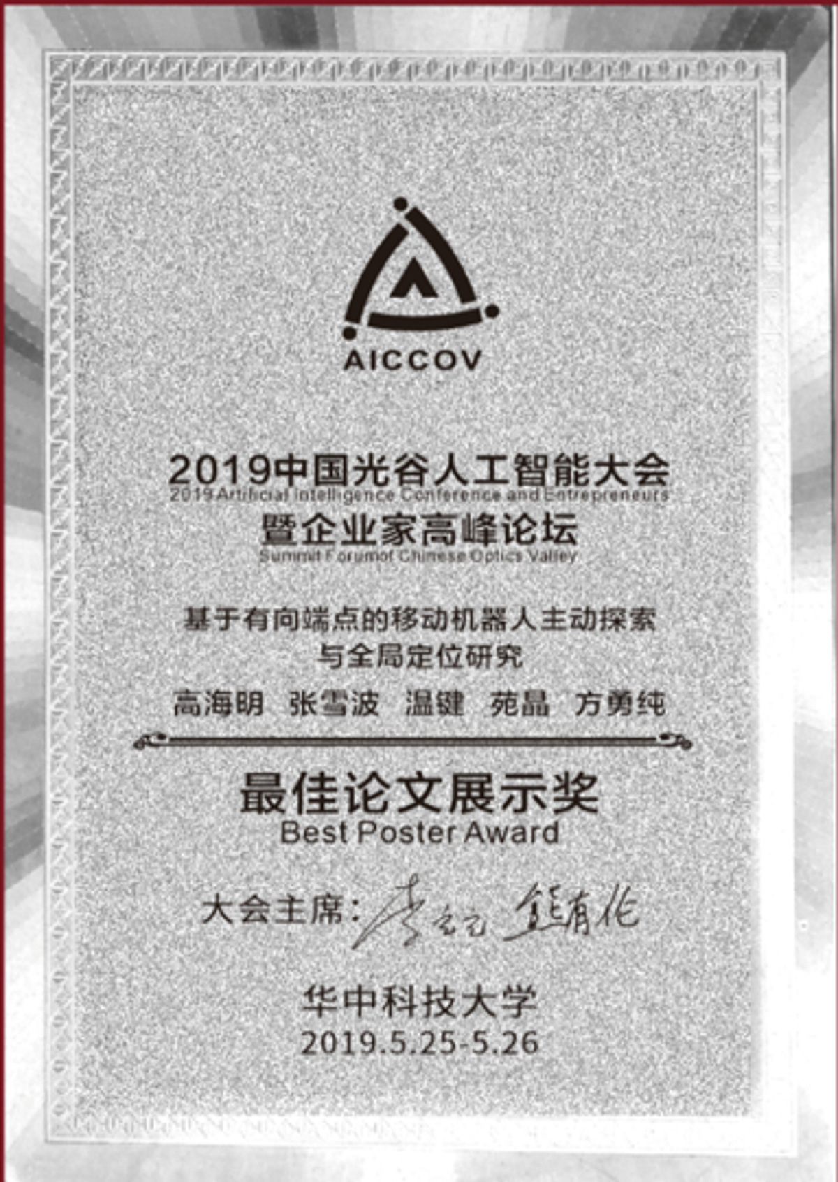 成果类型:求学成果展 成果简介:该荣誉为高海明同学在参加首届中国光谷人工智能大会所获荣誉,该生整合了研究生阶段移动机器人全局定位和自主探索的相关工作,该研究工作创新性的提出新型激光特征—有向端点特征,在应用于全局定位以及自主探索中取得了卓有成效的效果。