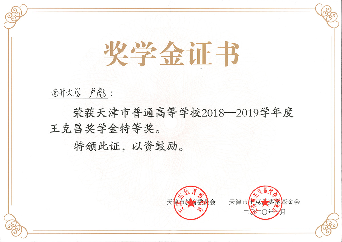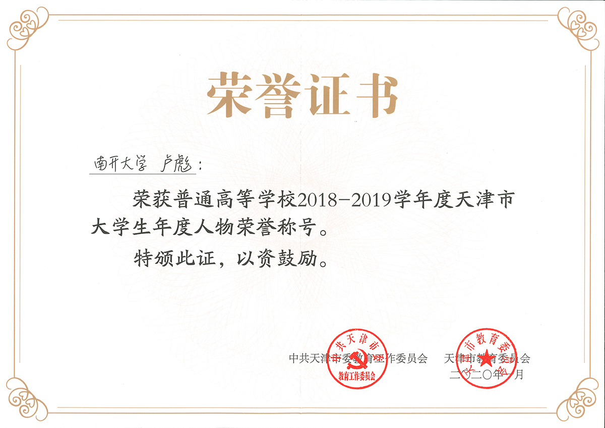 成果类型:求学成果展 成果简介:该证书为卢彪同学在天津市大学生年度人物评选中所获荣誉,该生在方勇纯老师,韩玲老师,郑月阳老师,吕雪艳老师,霍菲老师的指导下,付出巨大的努力,获得该奖项。