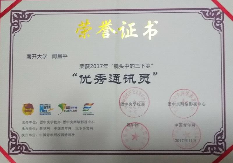 成果简介:该证书为闫昌平同学在全国大学生三下乡实践活动中所获荣誉,该生以镜头中的三下乡主题,获得该奖项。