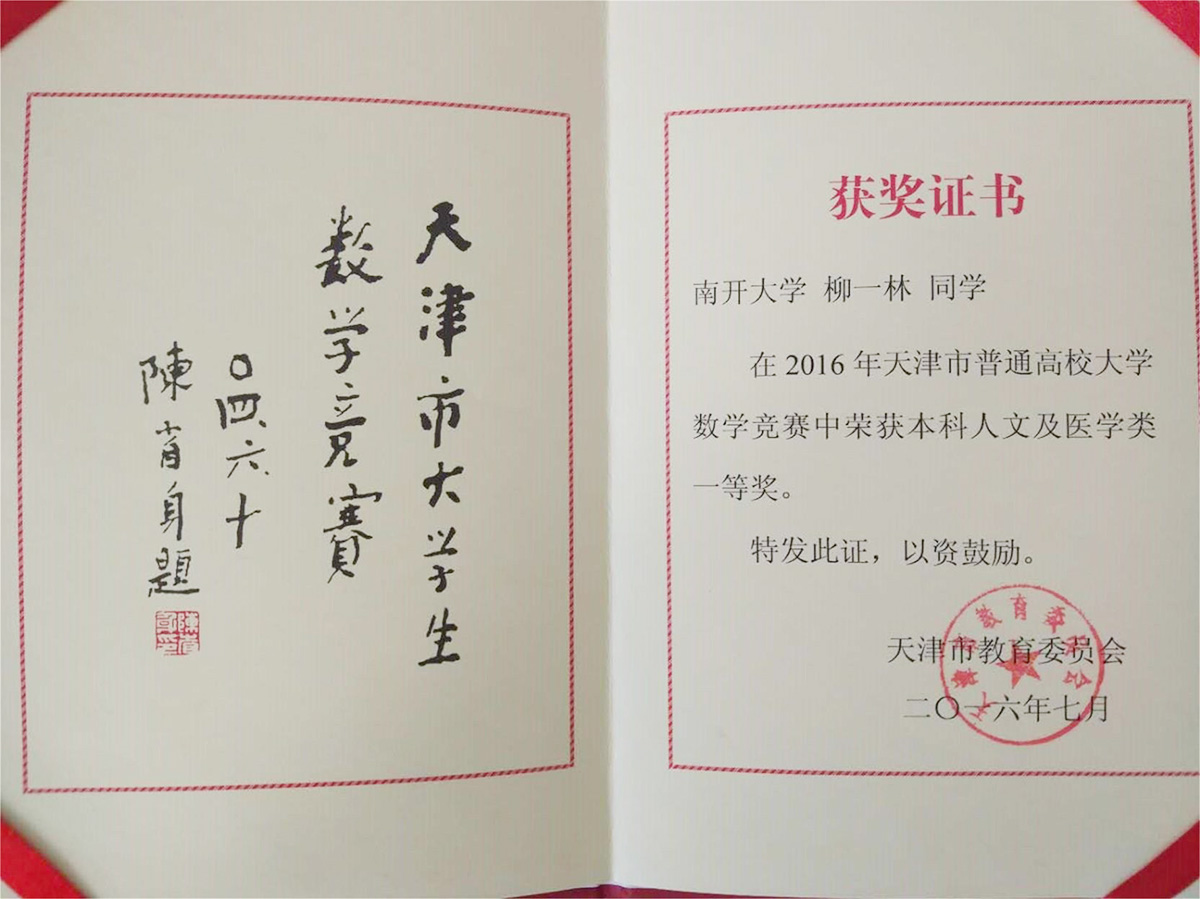 成果简介:该证书为柳一林同学在天津市普通高校大学数学竞赛中所获荣誉,该生以优异的成绩,获得该奖项。