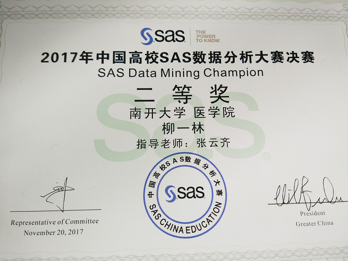 成果简介:该证书为柳一林同学在全国SAS数据分析大赛中所获荣誉,该生在张云齐老师的指导下,付出极大的努力,获得该奖项。