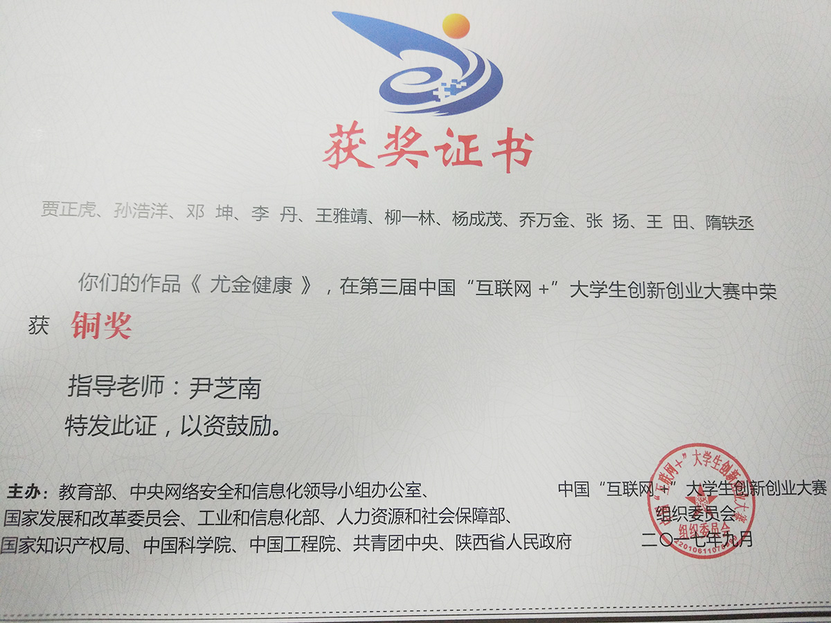 成果简介:该证书为柳一林等同学在第三届中国“互联网+”大学生创新创业大赛中所获荣誉,该团体付出极大的努力,在尹芝南老师的指导下获得该奖项。