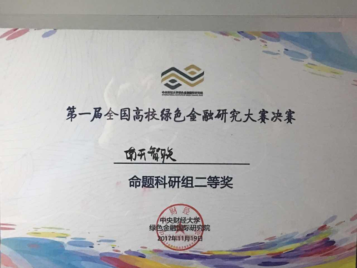 成果简介:该证书为南开智联在第一届全国高校绿色金融研究大赛中所获荣誉,该团体付出巨大努力,获得该奖项。