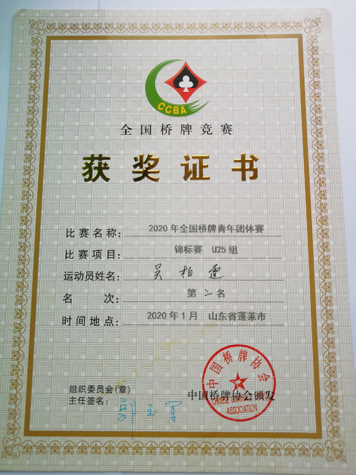 成果类型:求学成果展 成果简介:该证书是吴柏霆同学在2020年全国桥牌青年团体赛代表天津青年队获得的荣誉,这队主要由南开大学学生组成。这一荣誉是天津青年桥牌队史的最高荣誉。