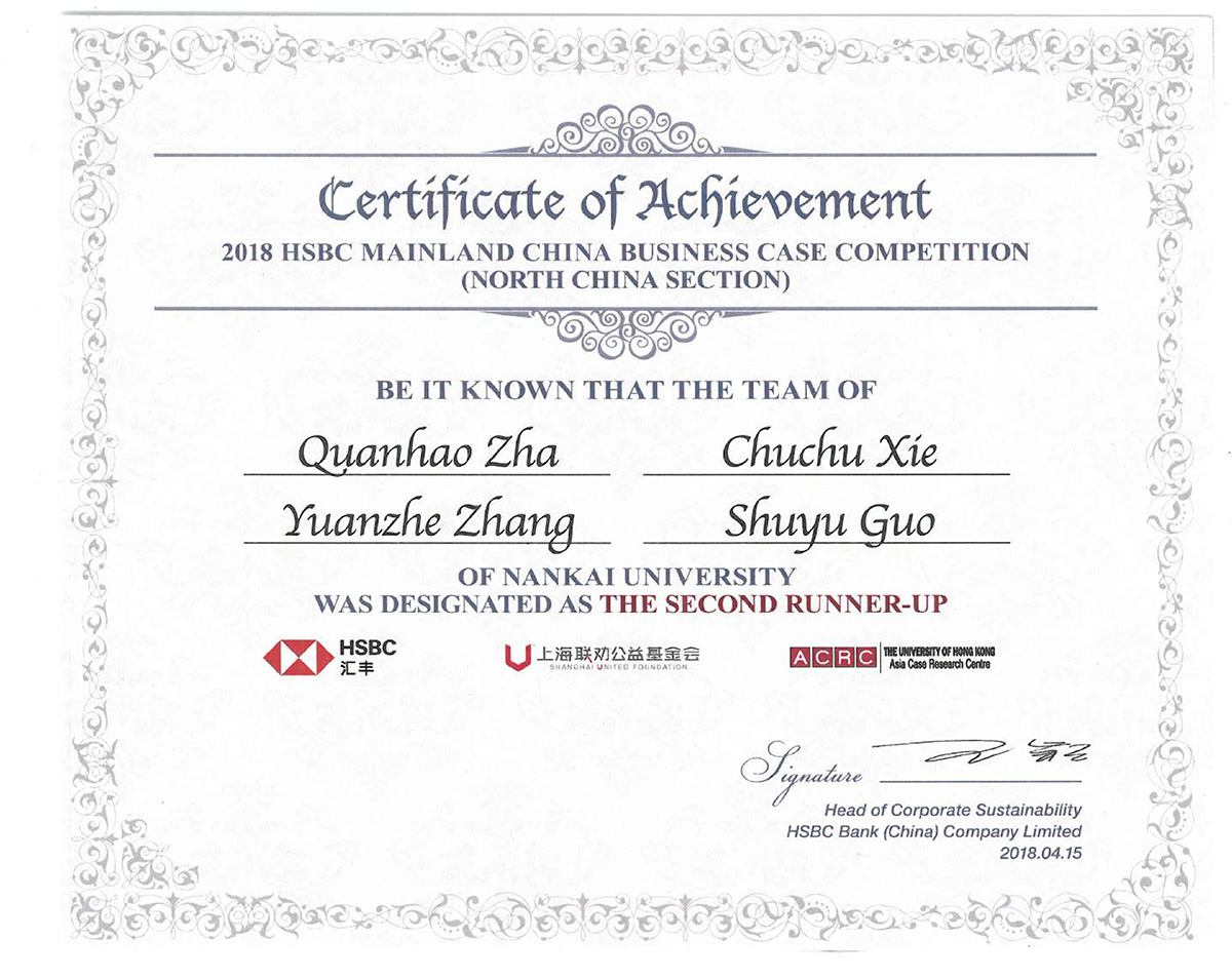 成果简介:该证书为郭姝雨同学2018年参加汇丰商业案例大赛,在与清北复交等高校的角逐中获得中国北区第三名的证书。