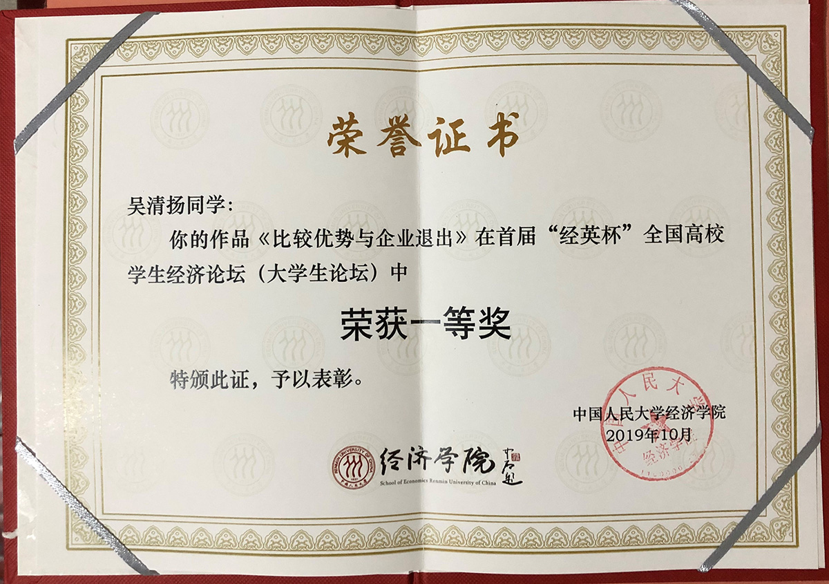 成果类型:求学成果展 成果简介:该证书为吴清扬同学在“经英杯”全国经济论比赛中所获荣誉,该生以《比较优势与企业退出:基于新结构经济学视角》主题参赛,在姜磊老师的指导下,付出3个月准备时间的努力,获得该奖项。