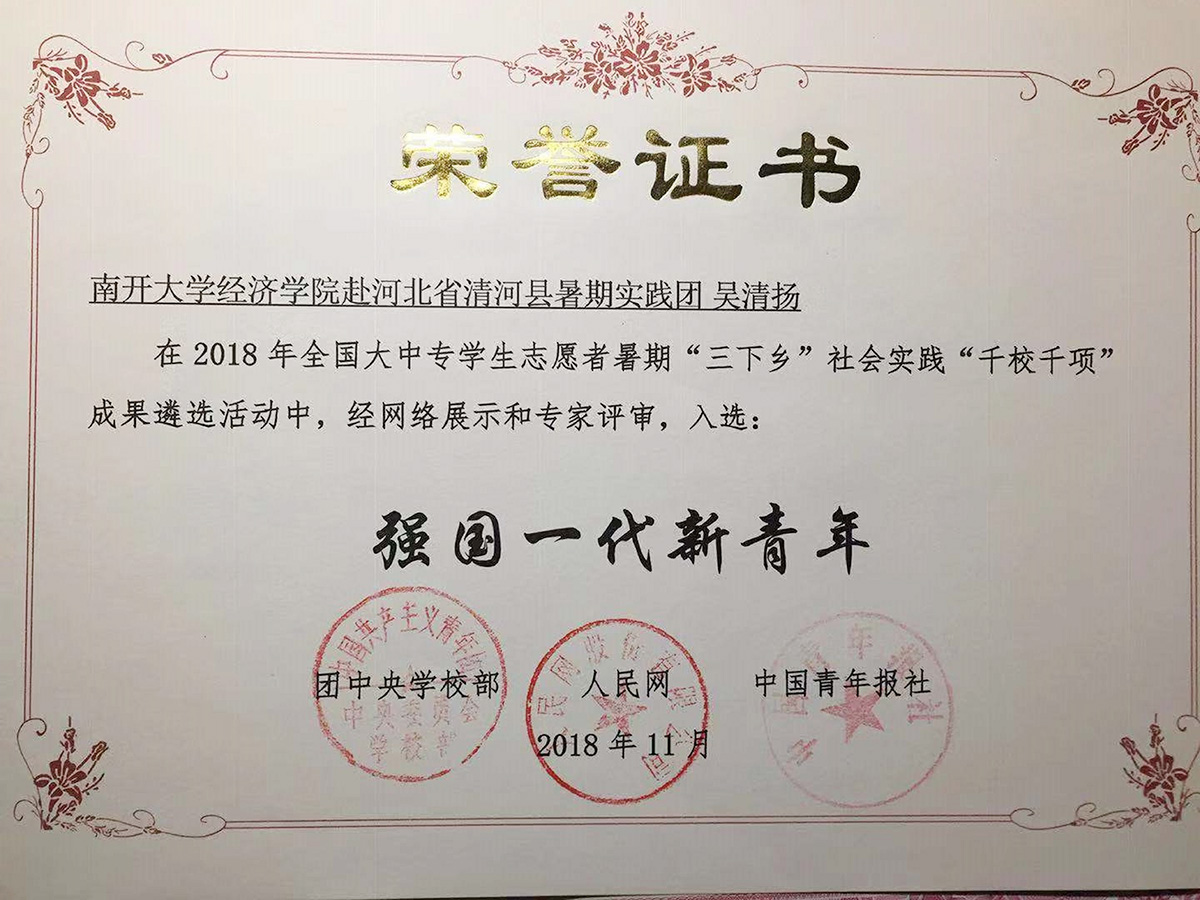 成果简介:前往河北清河暑期调研,团队实践成果丰富,被授予全国大中专学生“三下乡”优秀实践个人称号。