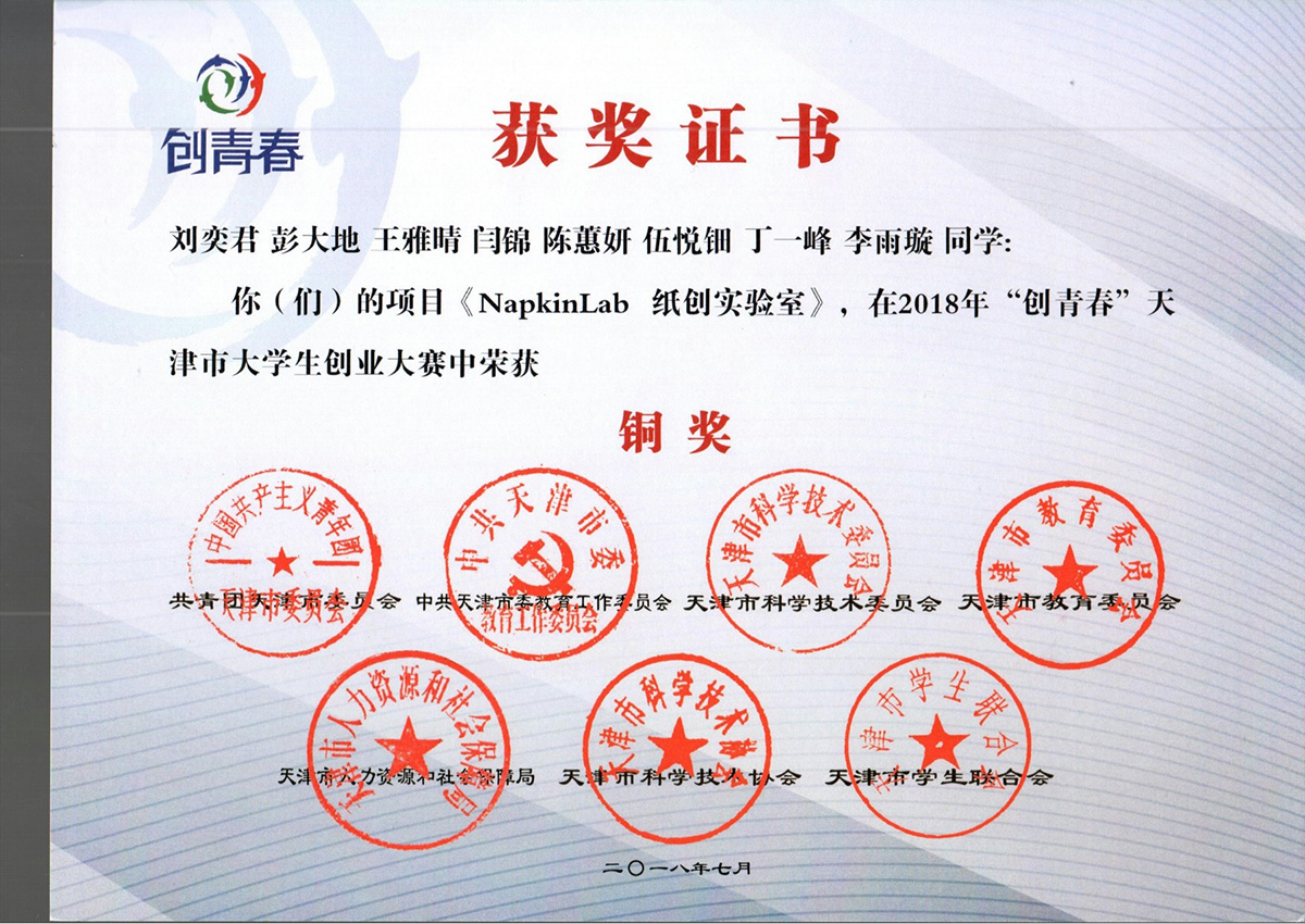 成果类型:求学成果展 成果简介:作为首席财务官,与团队策划进行名为“Napkin Lab纸创实验室”的创业活动,利用食堂桌面纸巾贩卖机向线上文创社交休闲APP引流,设计了精选文摘、科技商城、互动交流等板块并助力高校大学生创业孵化,作为南开大学“梦想+”一等奖项目报送天津市,终获市赛铜奖。
