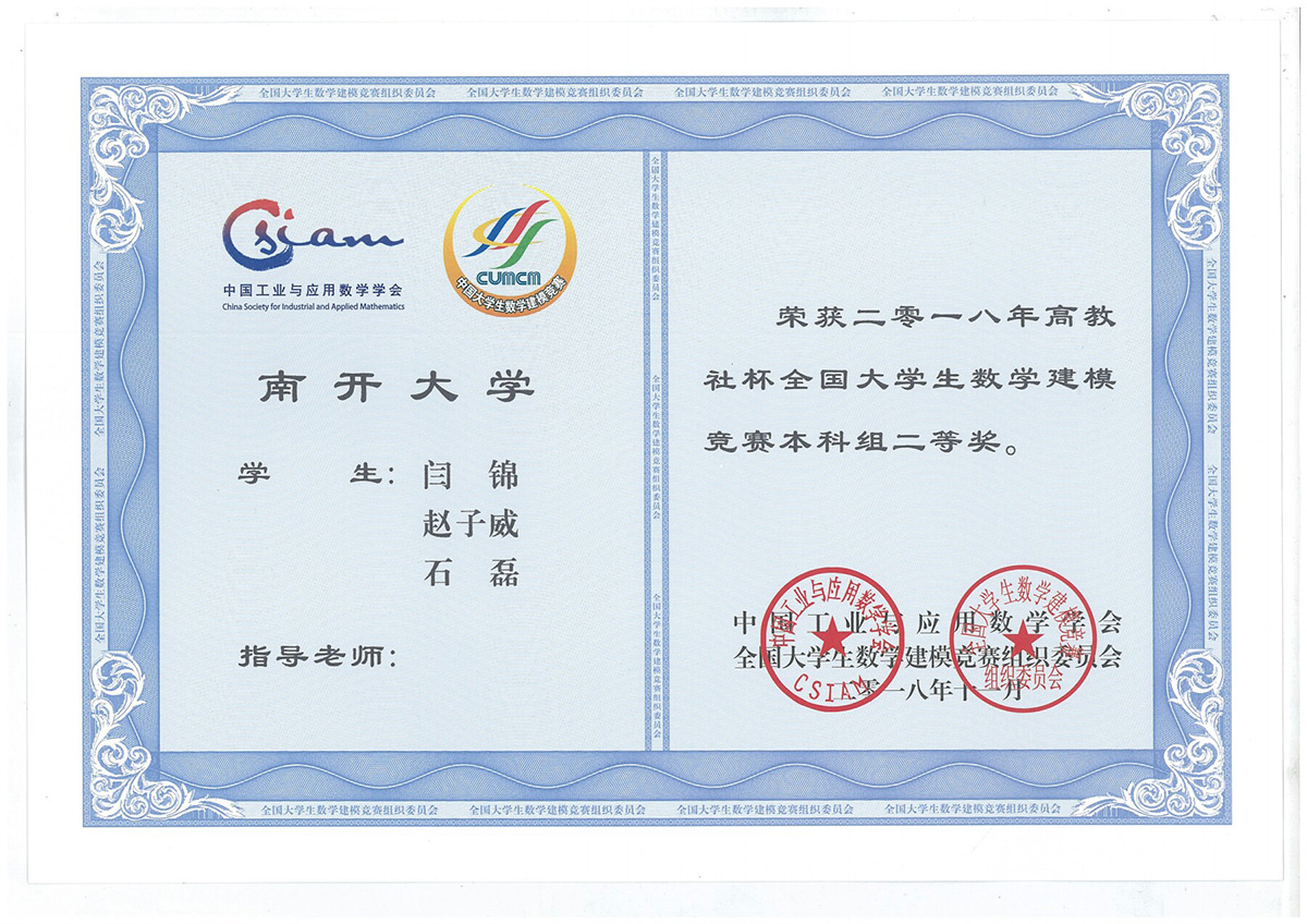 成果类型:求学成果展 成果简介:该证书为闫锦同学在2018年全国大学生数学建模大赛中所获荣誉,经过一个暑期的备战准备,和数院赵子威、石磊两位同学共同完成对“高温作业专用服装设计”的模型构建和论文撰写,最终获得全国二等奖。