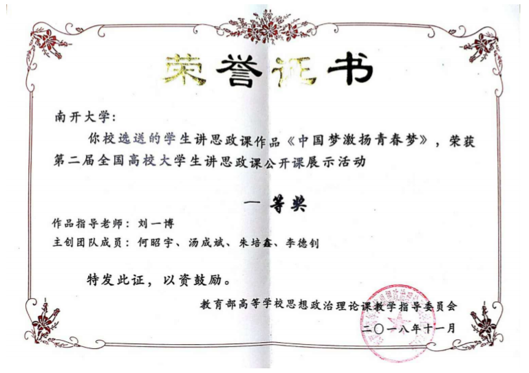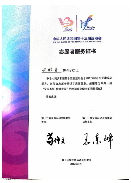 成果类型:求学成果展 成果简介:两张证书分别为何昭宇同学参加中华人民共和国第十三届运动会志愿服务的证书以及参加第二届全国高校大学生讲思政课大赛获一等奖的证书,体现何昭宇同学积极参与志愿服务及理论宣讲的经历。