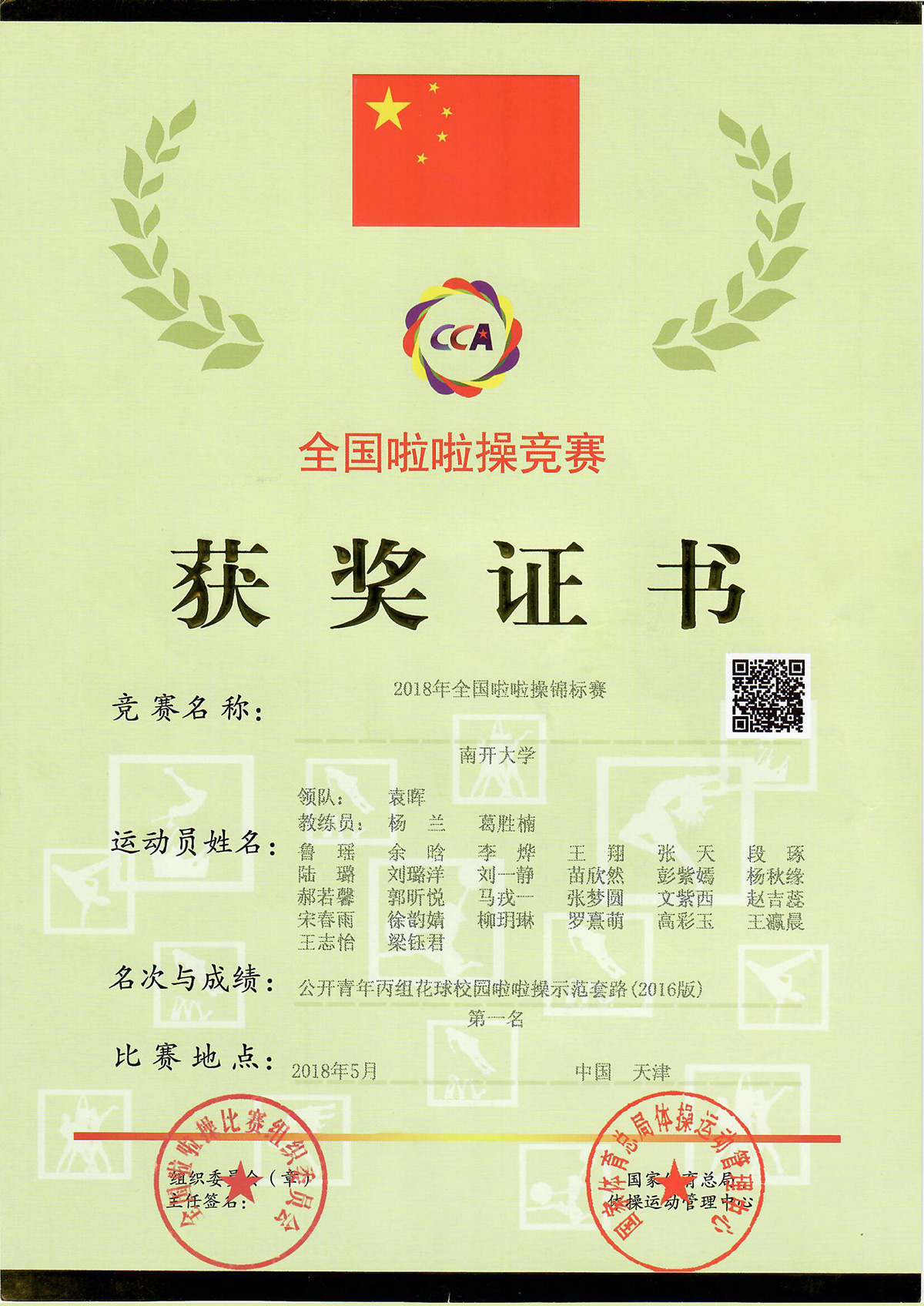 成果类型:求学成果展 成果简介:该证书为郭昕悦同学在全国啦啦操锦标赛上所获荣誉。该生积极参加体育运动,曾担任津南校区啦啦队队长,在体育部杨兰老师、葛胜楠老师的指导下,获得啦啦操锦标赛花球项目团体冠军。