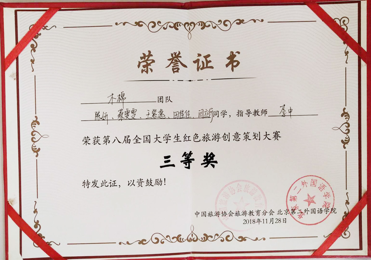 成果类型:求学成果展 成果简介:第八届全国大学生红色旅游创意策划大赛决赛奖杯。旅游与服务学院2016级本科生五人组队,以四川攀枝花为目的地进行策划,获得华北赛区第一名,决赛全国第五名、三等奖的成绩。
