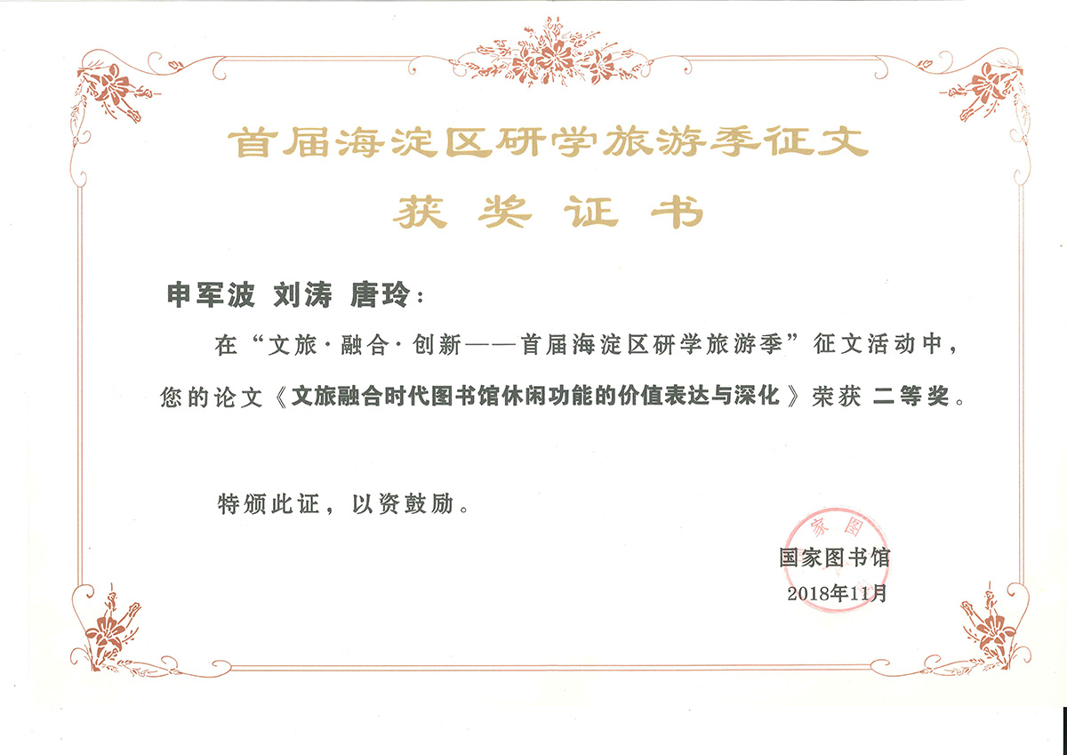 成果类型:求学成果展 成果简介:该证书为申军波、刘涛、唐玲三位同学共同撰写提交的《文旅融合时代图书馆休闲功能的价值表达与深化》学术论文参加“文旅·融合·创新——首届海淀区研学旅游季”征文活动获得二等奖的荣誉证书,该论文已于2019年被收录在由国家图书馆出版社出版的《研学旅游新发展及案例探析》一书当中。