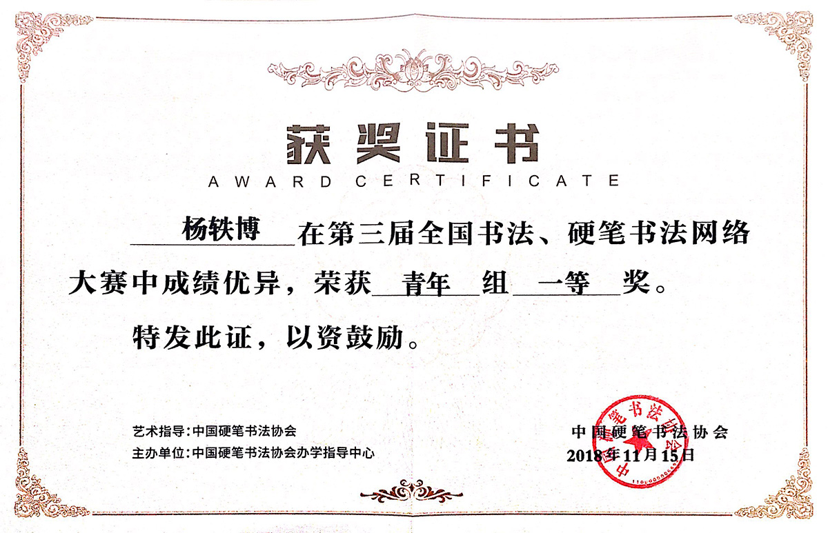 成果简介:该证书为杨轶博同学在全国网络书法大赛中所获荣誉,以“歌颂祖国”为主题参赛,付出很大努力,获得青年组一等奖。
