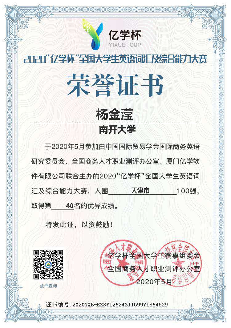 成果简介:该证书为杨金滢同学参与2020年亿学杯全国大学生英语词汇及综合能力大赛天津市100强荣誉证书。