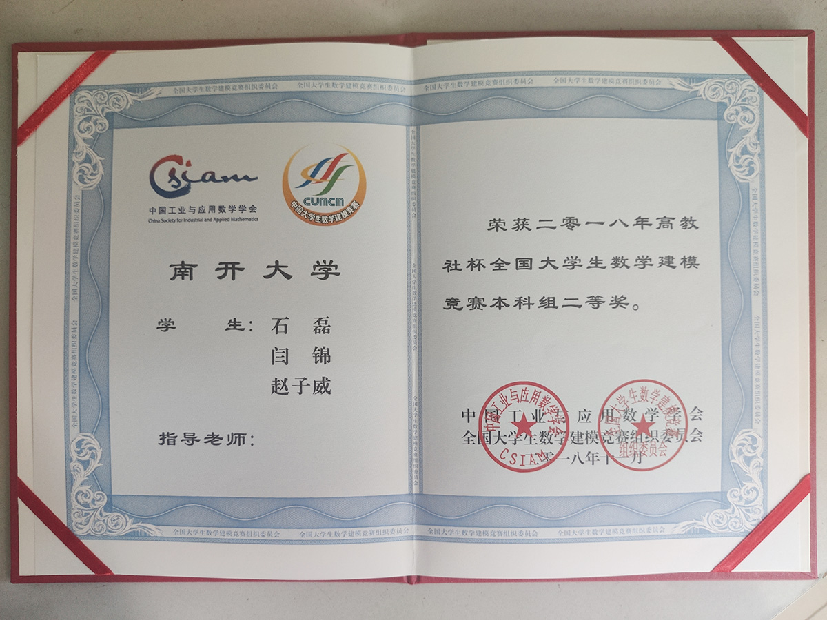 成果简介:该证书为石磊等同学在全国大学生数学建模竞赛所获荣誉,该队伍在论文中解决了高温防护服设计问题,获得了国家二等奖的荣誉。